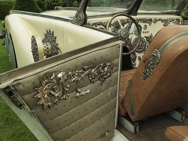 That enormous body and the interior are covered with tributes to Hindu gods, such as Ganesha, and symbols. Underneath all of that fiberglass is a Land Rover Fire Tender chassis. A Rover V8 gets the six 28-inch wheels spinning.