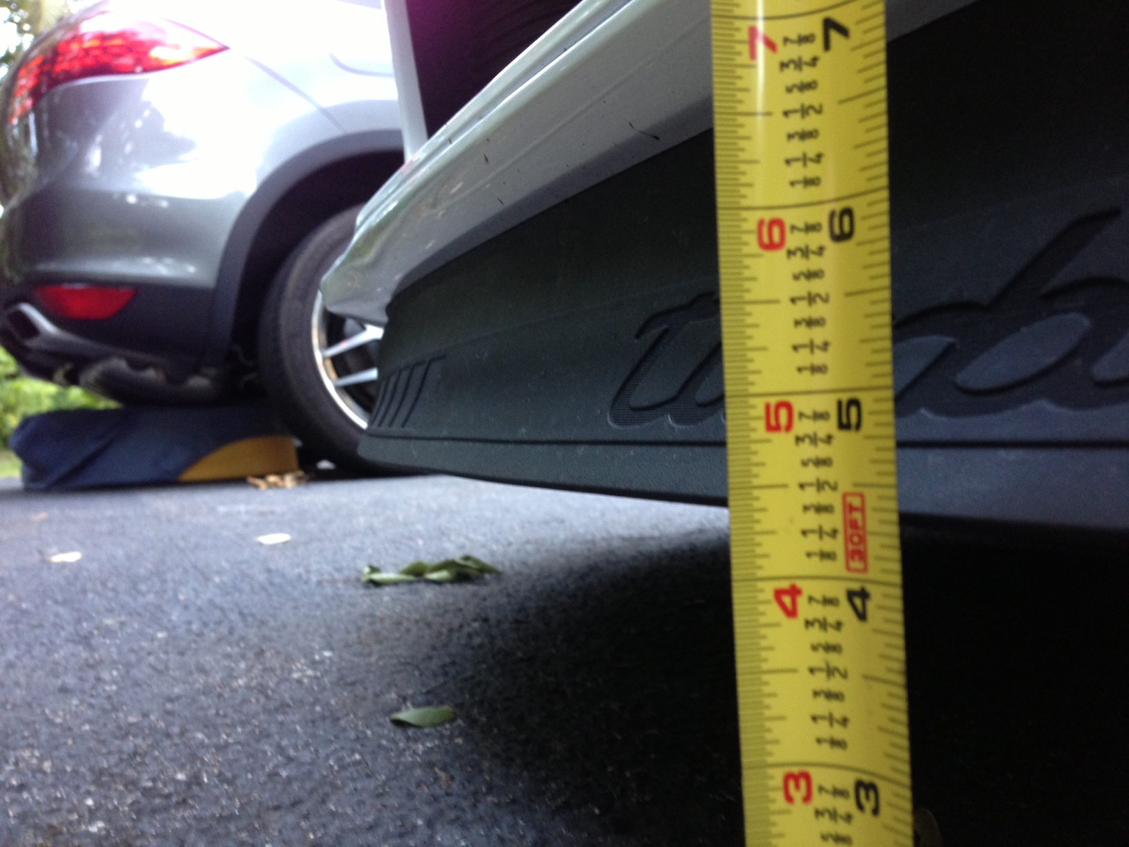 It looks like the clearance is 4-3/8". I did slide over a poured concrete curb with the spoiler up and the front lifted a bit. The painted bits didn't get scraped since the rubber took the hit with no visible damage to that either. I should rig up no-go to see if it will clear a 6" precast curb stop.