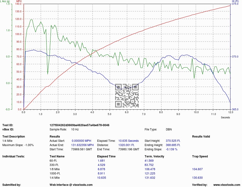 In fact, my quarter time on the day I got the car back from adding the mods was 10.571 @ 129.54 with a 60ft of 1.59 and three weeks later it was 10.65 @ 130.63 with a 1.68 60ft so the only difference in ET is the 60ft but the trap speed is 1mph faster three weeks later so you might conclude the car got faster. No de-tuning there. When someone offers real proof then we can discuss it, until that time it's just a baseless claim. My data show my car got faster with time, which counters the claims made about the ECU adapting the module out.