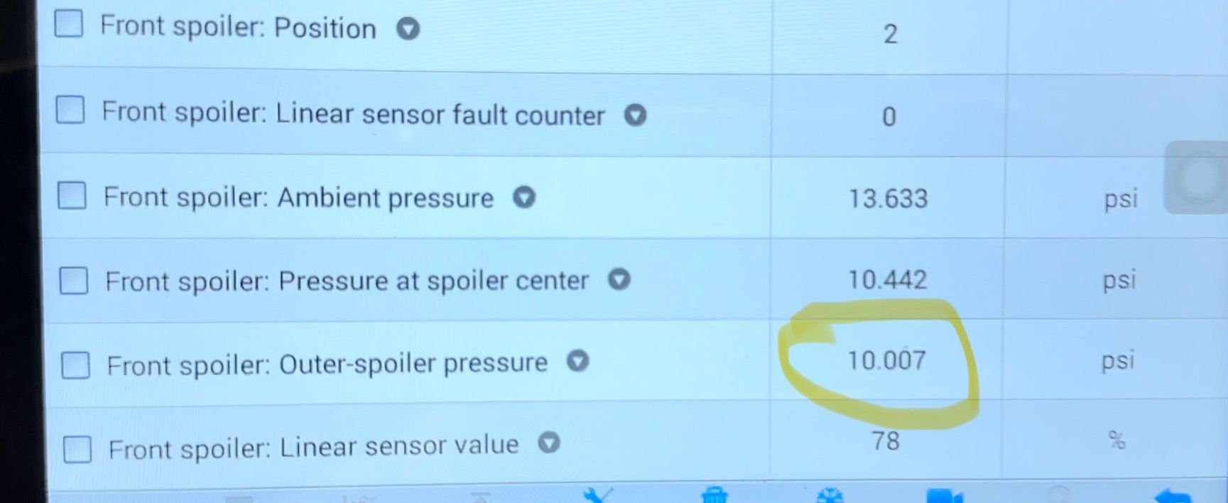 Tonight I discovered that the “outer spoiler” in the front is losing pressure. When I activate the front spoiler, I initially show around 10 psi for “outer spoiler pressure.”