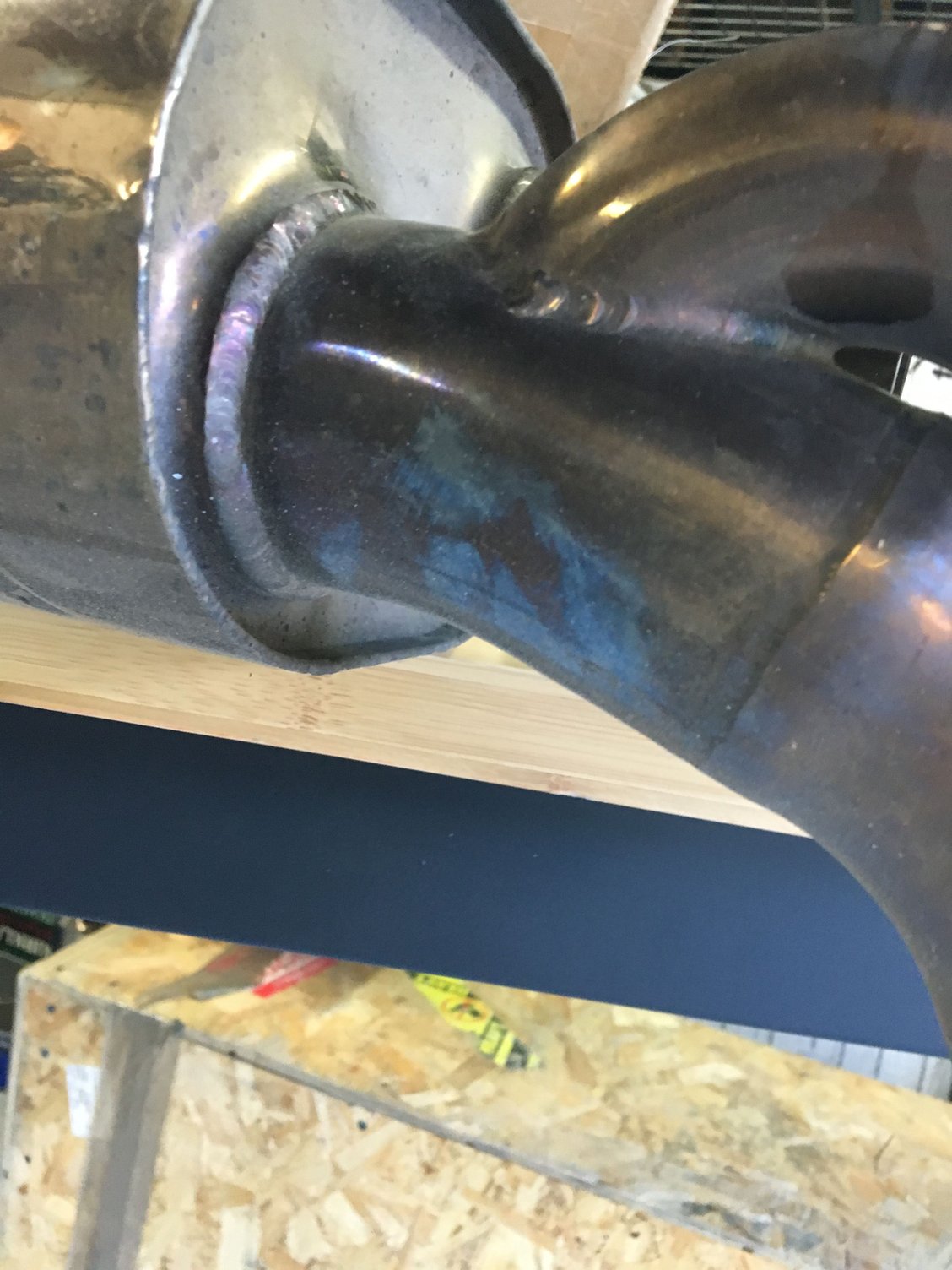 An exhaust system that has some bluing on the exit from the canister furthest from the turbo, on its way out with no bend at all