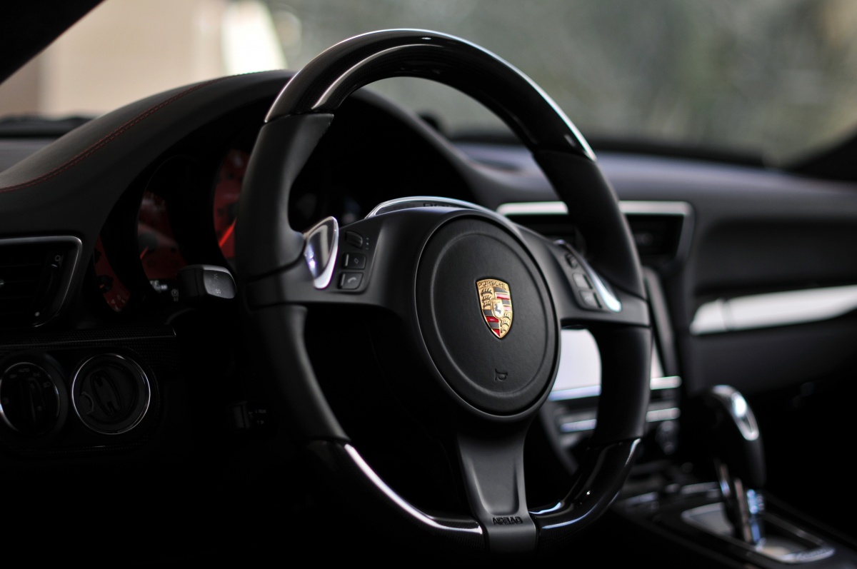Love the way your steering wheel looks? Is that carbon? The ones I have seen at Porsche are greyer in color, yours look almost black?