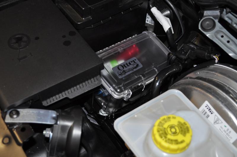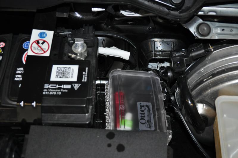 I wanted to find a place to carry a very basic tire kit without sacrificing the limited storage places in our car. After some digging around, I came up with the following. The space isn't water proof, so a case was required. I'll also get a smaller one and place in front of the brake booster. The case, an Otterbox 2500, is velcro'ed at the bottom, although it really doesn't have anywhere to go.