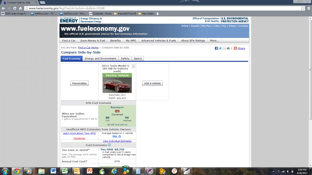 Never trust the electric estimates for a tesla, you'd be suprised how often you travel over 55 mph and how often you'll realize how heavy your foot is when you launch a half a ton car off red lights. the bad thing the car is so big and bulky people don't expect it to be as fast as it is so you get caught off a lot and feel invisible (a feeling we are all quite used to being p-car owners)