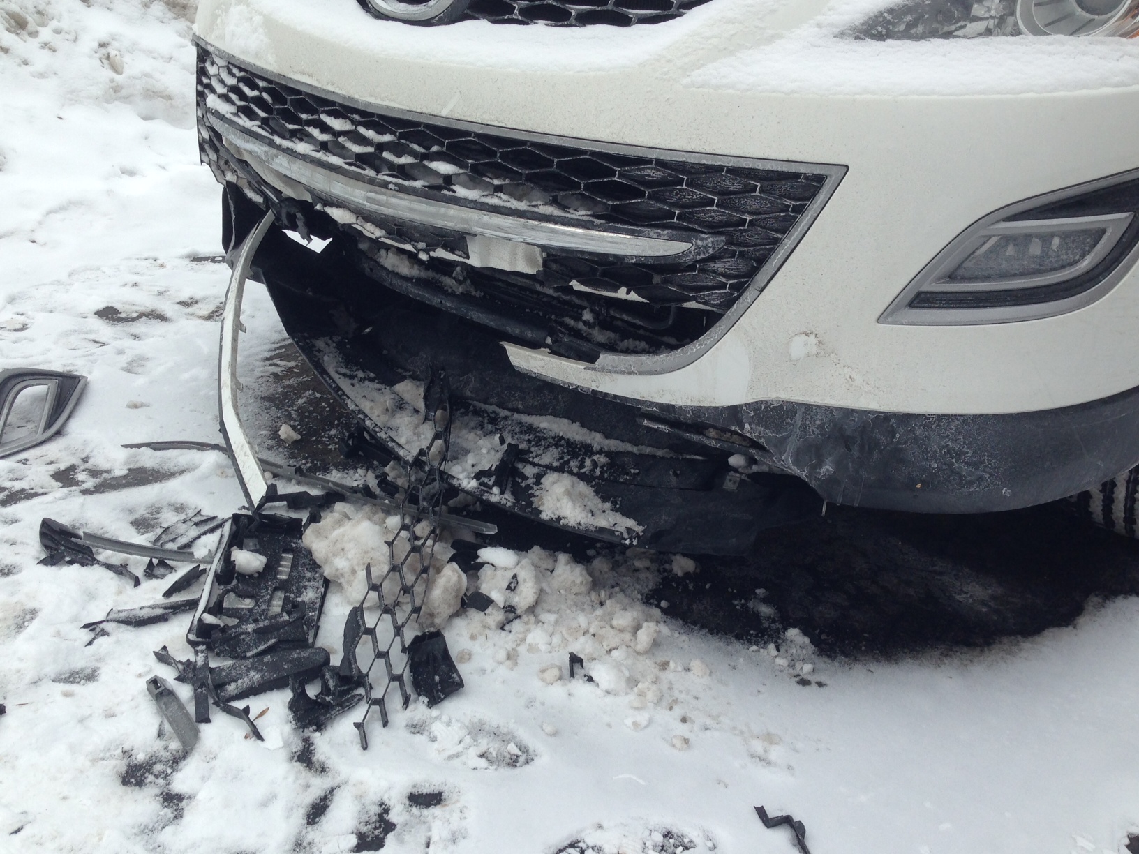 Yeah, that dumbass in the "no season" tires would be me. Here is what I did to the family truckster. I crashed it at 5mph in my own driveway.
