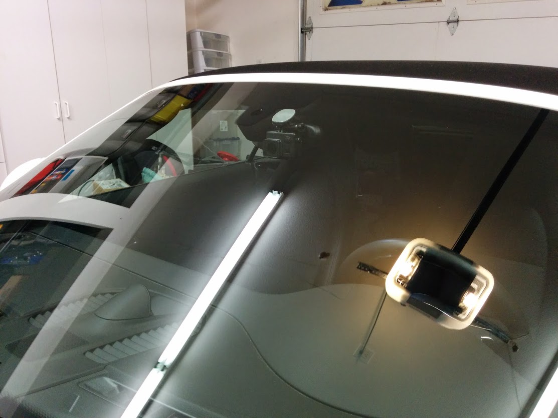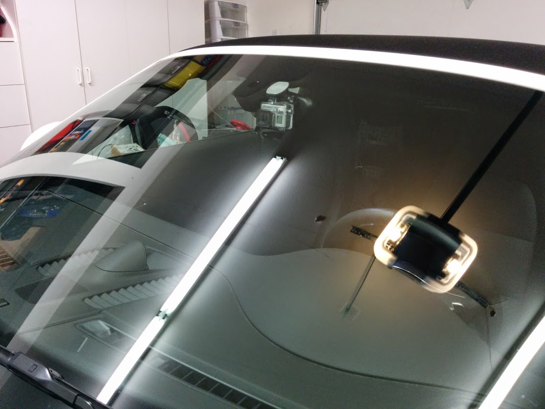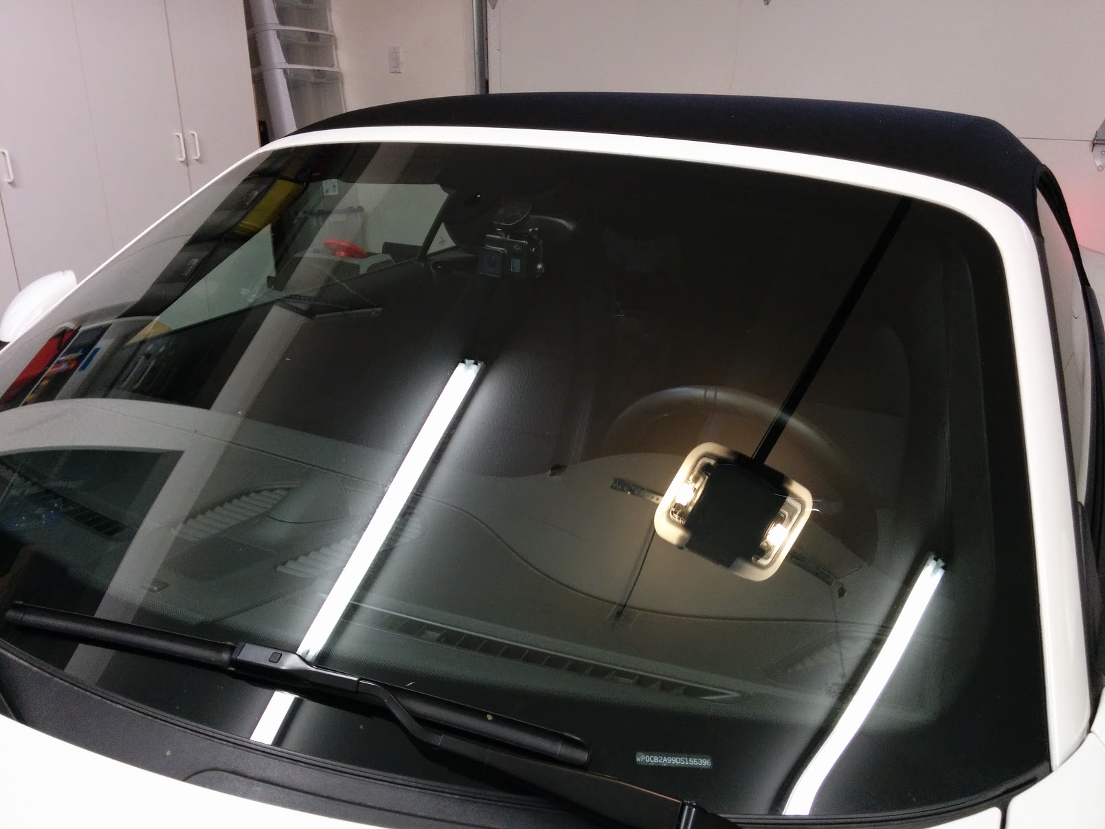 Next I decided to try an adhesive mount on the windscreen, right behind the rear-view mirror. This worked pretty good, much less un-sightly. You get a pretty good field of view without eating much of the driver's line of sight. Two issues though: The glare from Sport Chrono is front and center, and though the mount is black, the adhesive strip turns out to be white, so it's visible through the glass... need to look into possible black tape alternatives. Additionally, the exoskeleton that comes with the GoPro really stands out, for a stealthier option, I purchased the blackout case.