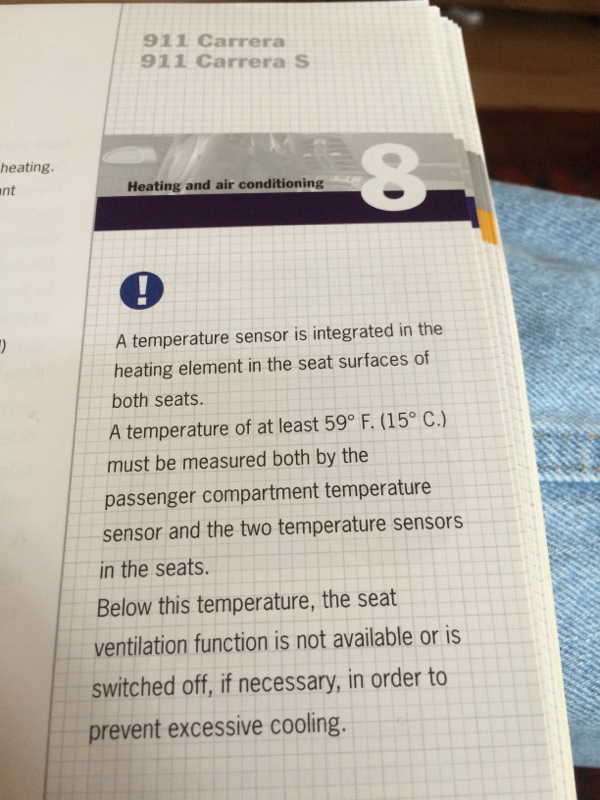 Really. I used the seat ventilation on the day I picked my GTS up and it was around -10C (say 15F). This was after the car warmed up mind you... I was sitting in traffic with a wool coat on and the ventilation worked great at cooling me off. Does the book specify if this is external temp or internal temp?