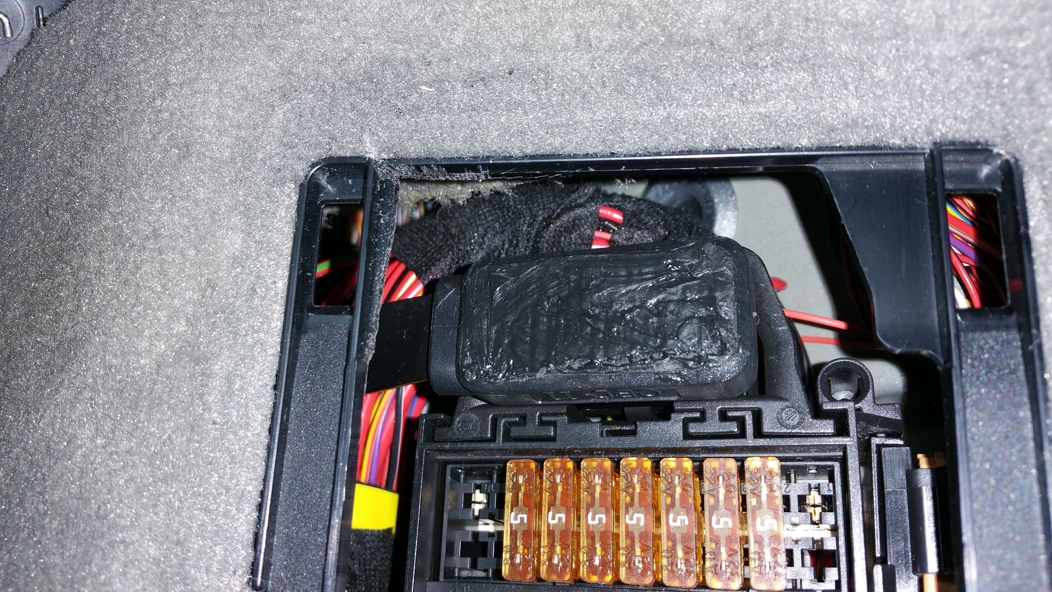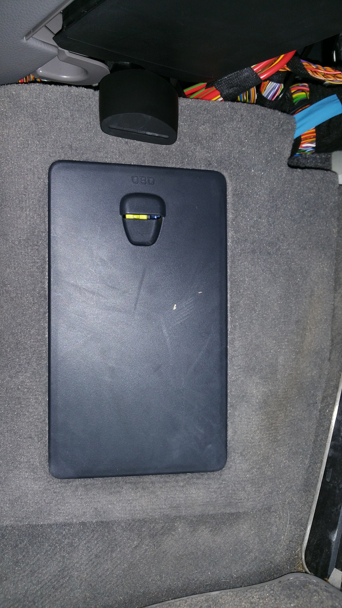Fortunately, the pins were submerged in rubber so they cut clean and I sealed them with silicone. The OBD plug fits and the cover can be replaced as normal. I ran the wire to the top of the panel and secured the new OBD connector out the top. You can see it with the car adapter attached. The one issue was because of this particular flat wire plug I had to trim part of the fuse cover bracket on the bottom right as it interfered with the wire (see picture).
