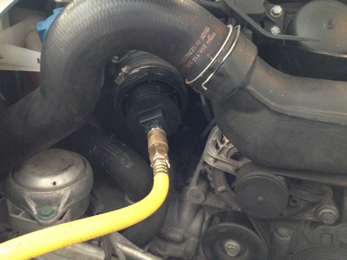i plugged the tester into an air compressor regulated at 25 lbs the 2 rubber couplers mount onto the turbo air inlets.. you can hear all the air leaks and you rub around the hoses and clamps with your hand and when you get close the pitch changes