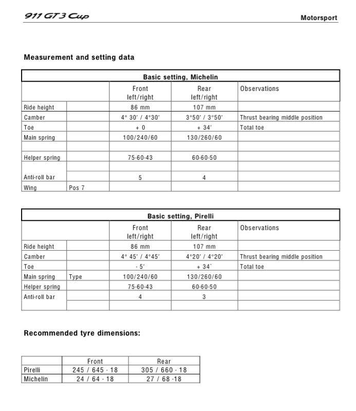Regarding 996 Cup ride height variance you may have seen, per the Porsche Cup maintenance manual, there is none. Ride height is clearly spelled out as 86mm front and 107mm rear. Fine tuning is allowed to bring corner weights within specifications. Other than that, Porsche does not give you leeway. This is clearly done to make sure the shocks are operating within their design specification. For example, if you raise the ride height up, you will severely limit the already minute amount of droop built into the shocks.