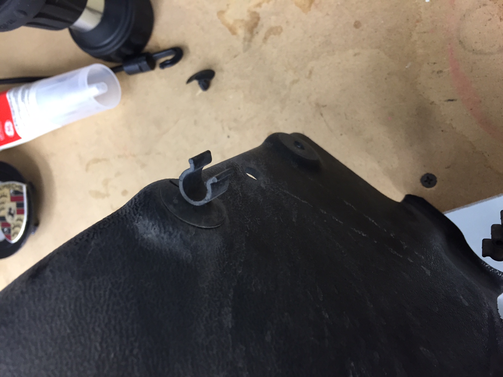 This part is attached to the front suspension and is most likely an air duct. One is broken and the other needs the push rivets that you can see in the second picture. I cannot locate these on the parts catalog so any help with part numbers for the duct and the push rivets would be great.