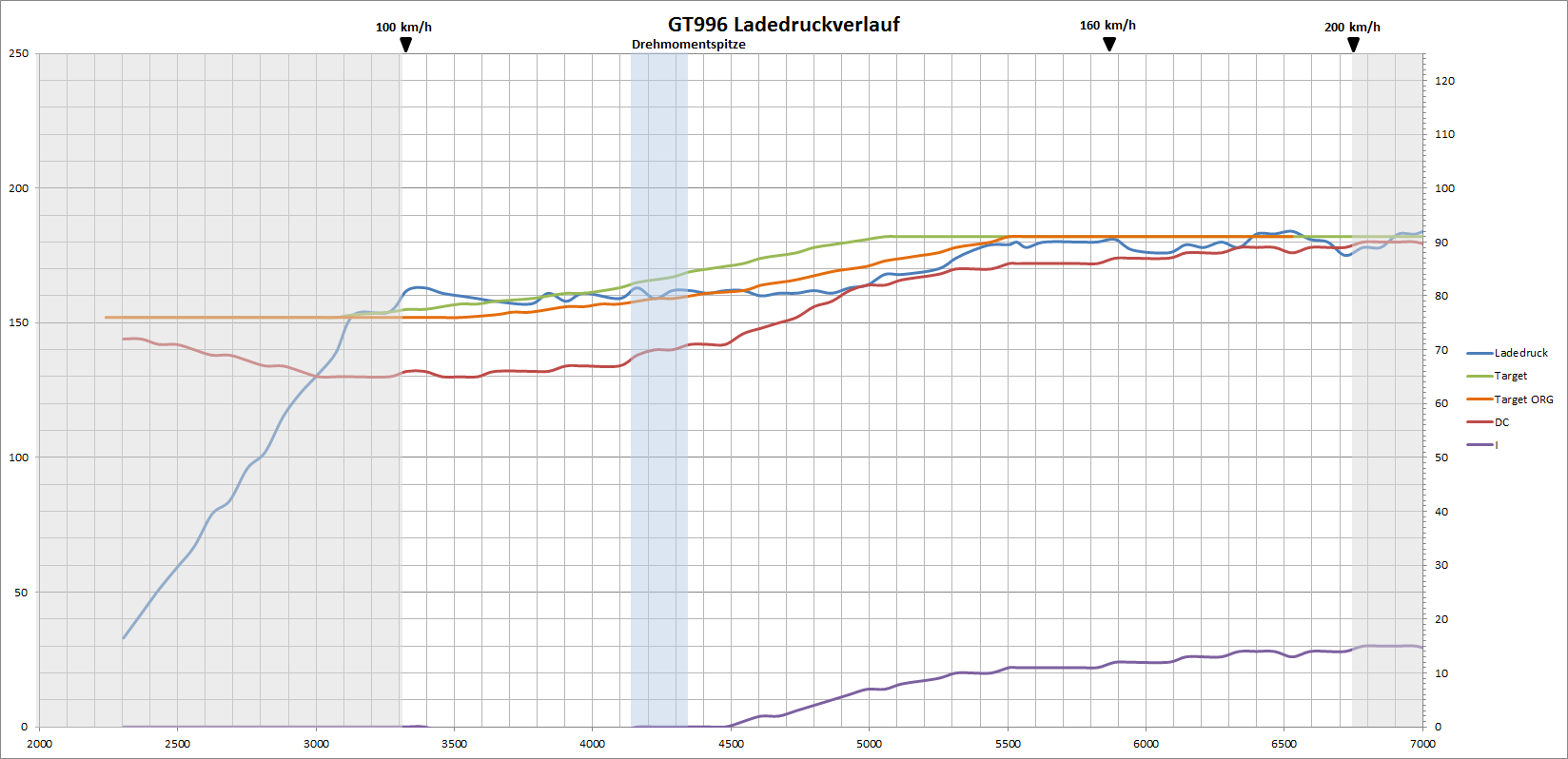 I am also using boost by rev and a boost ramp. My target boost shows a delay by about 500 revs compared to what really is measured and that's why I shifted the target on the Plex by 500 rpm and the graph shows the resulting curves (blue is boost, green is target, red is DC and purple is I). I try to keep P and I as low as possible by manually tweaking the system to be as close as possible to what I want before I let P and I do the rest. After the target is initially met, the P stays at zero.