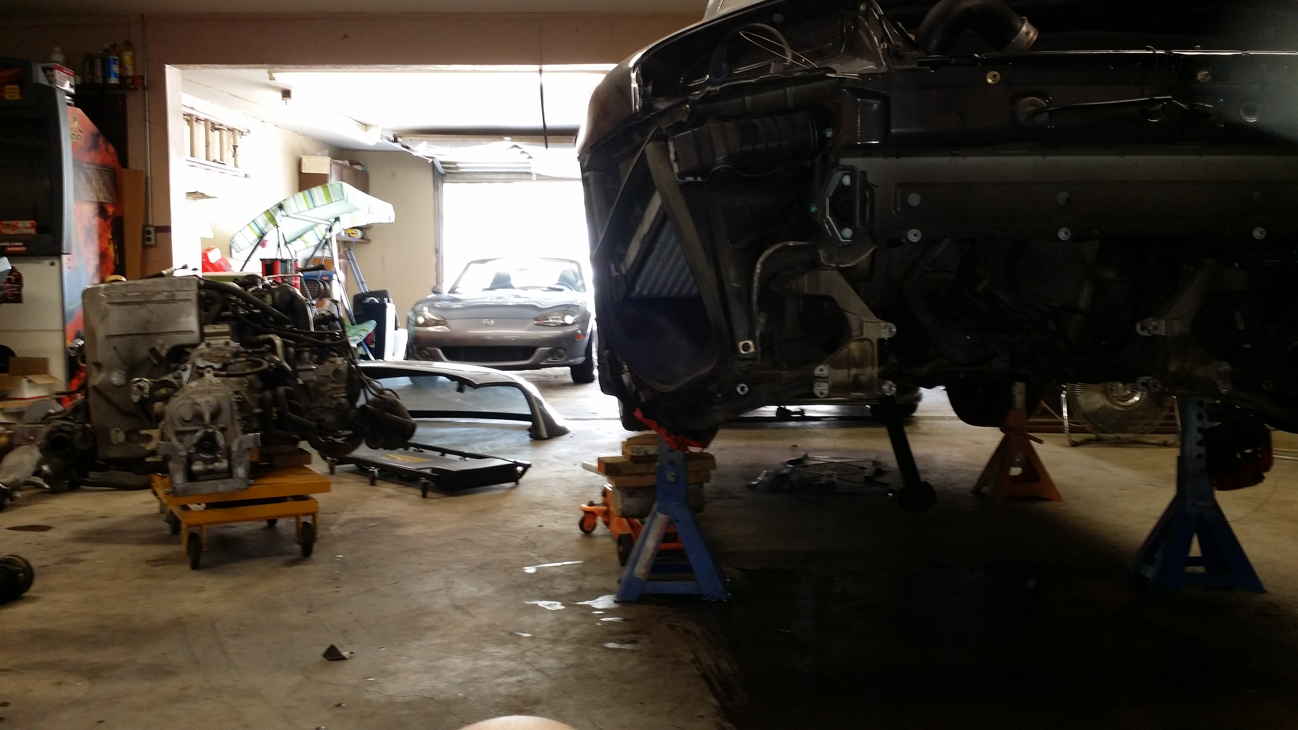 4. Next we’ll raise the car up. If you are one of those fortunate guys that have a lift, we are all ragingly jealous and hate you. You may substitute this step with “I used my lift like a boss” and move to the next one. If you don’t have a lift in your garage, like the rest of us, you’ll be jacking the car up onto 4 jack stands in an agonizingly slow and controlled manner. You are supposed to have jack pads like what a lift would have. (See something like this Amazon.com: ESCO Jack Stand - 3-Ton Capacity, Model# 10498: Industrial & Scientific ) but I didn’t have that. Seeing as how I already have 8 jack stands, I decided to use the 4 extra-large jack stands I do have. So far they are working just fine, and didn’t hurt the factory lift points. Whatever jack stands you go with, make sure they aren’t your normal run of the mill small ones. You are going to be lifting the car up very high and need the stability that the extra-large ones provide. If you use small ones you are asking to die an ironic and agonizing death having been crushed by your childhood dream car later when the engine comes out. Don’t attempt to get your car as high as we’ll need with small stands. When jacking the car up I found the easiest thing to do is to use a thin piece of wood and jack from the front frame rail on one side. This will lift the entire front, driver and passenger. Get it high enough to put jack stands on the front, then go to the back and jack from the rear sub-frame behind the rear wheel. That'll get the back up. Then go back and forth slowly raising the car higher and higher front to back. You’ll want to get the bottom of the body 19-22 inches in the air. The higher the better. Mine sat at 19.5. It took me more than an hour being careful. You don’t want to go out but a click or two on the stands each time else you risk the car falling to the side being leaned on. If you’re car falls it’s going to be some expensive damage, so take this warning seriously. Once it’s to the desired height, push on the side of the car a bit and ENSURE it’s up there stable. The last thing you want is this thing falling on you, or teeter tottering later due to shifting weight. If it’s all good, it’s time to celebrate! If not, the jacks aren’t on the same stop, or your floor isn’t level. Figure it out, but make sure it’s safe and the car won’t fall else you are risking death. Getting the car this high in the air is one of the more agonizing moments. Time to start getting it ready to come out.