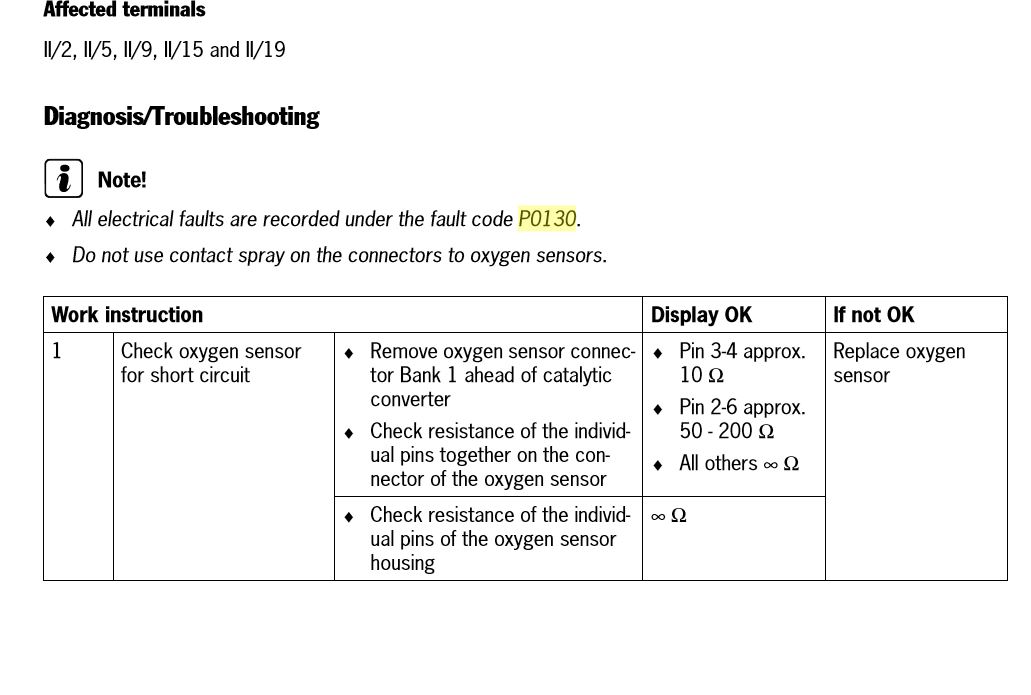 Remove sensor connector bank 1 ahead of the converter. Check resistance between pine 3 and 4 towards [sic] the oxygen sensor. 3.0 to 3.5 ohms at 20C is ok. Anything else not ok.