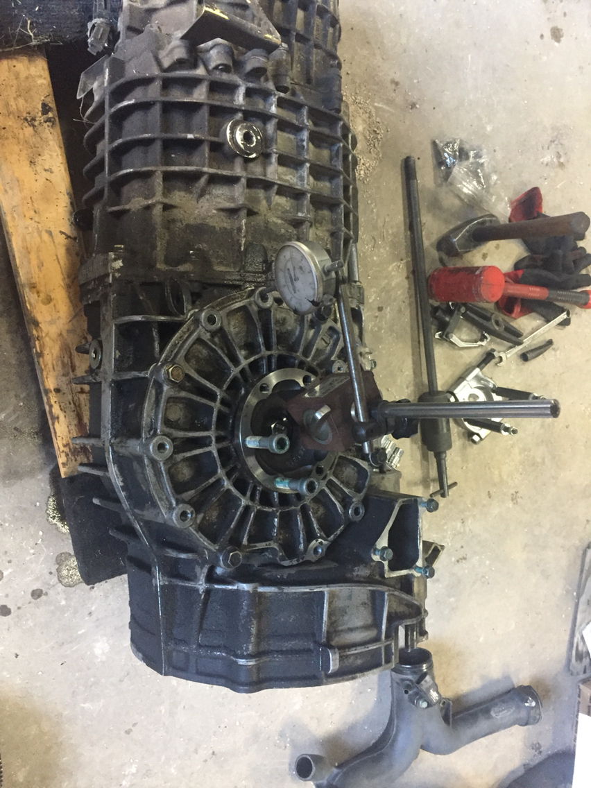 After measuring the stock differential flange to bearing race and comparing taking into account the new bearing thickness versus the old worn we determined that the inner bearing needed 3.8mm(2mm & 1.8mm) for shims. So, this week I got some of the shims I ordered. A little bit about the Porsche shims. The shims range from 1.5mm-3.8mm in .05mm increments. Once we got the inner bearing shimmed, i measured the height from the flange to the bearing race. So then I pressed in the inner bearing race. Then installed the outer test bearing with 1.8mm shim. The installed the outer bearing race into the side cover. The new stub shaft seals will be left out until the final bearings are installed. Then i installed the stub axle and a magnetic dial indicator. Then index the dial indicator on a flat surface and measure the outer bearing gap by lifting carefully on the stub axle. I checked this measurement in several different locations and a bunch of times to and duplicate a measurement of .025" which is .66mm. So i need 2.5mm of shims plus what will be needed for preload. Most people will take that measurement and add .4mm. So by my measurements i will need 2.9mm which does not exist in any combination of the Porsche shims.