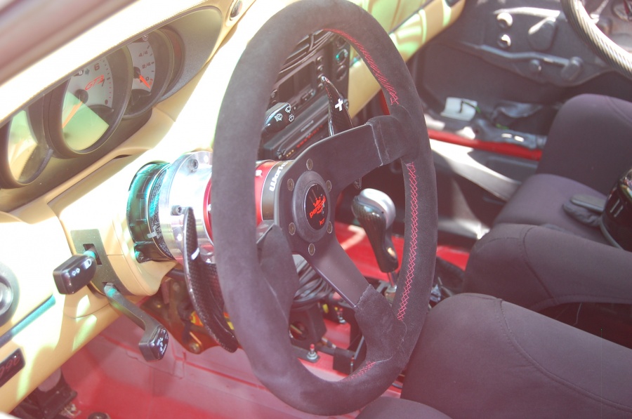 Thanks! The paddle shifter are from Works Bell and the quick release hub is from the same company. Steering wheel is a Personal Fitti. It was installed by Flat Six Motorworks in Miami Fl. Had to modify it a bit in order not to have a harness when the wheel is removed. I had to delete the horn, but its not required on the track. Im not sure what tires you are running on the rear but probably 305's or 315's. I think the 315's are as wide as you can get in the rear without running into safety issues. Front ones Im still waiting on a response. Take care and have fun with your Porsche!