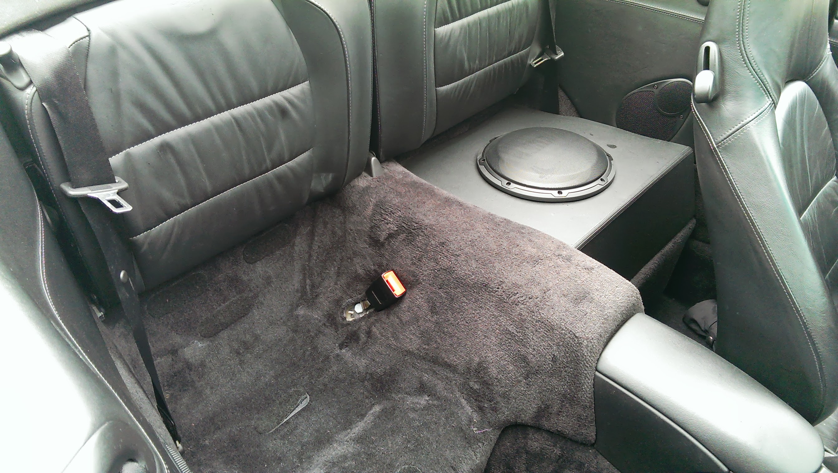 I have a set of custom built subwoofer housings that are made of fiberglass and completely fill in the rear seat area. They are attached to the seatbelt bolt so they can't move around. Something like that would work.