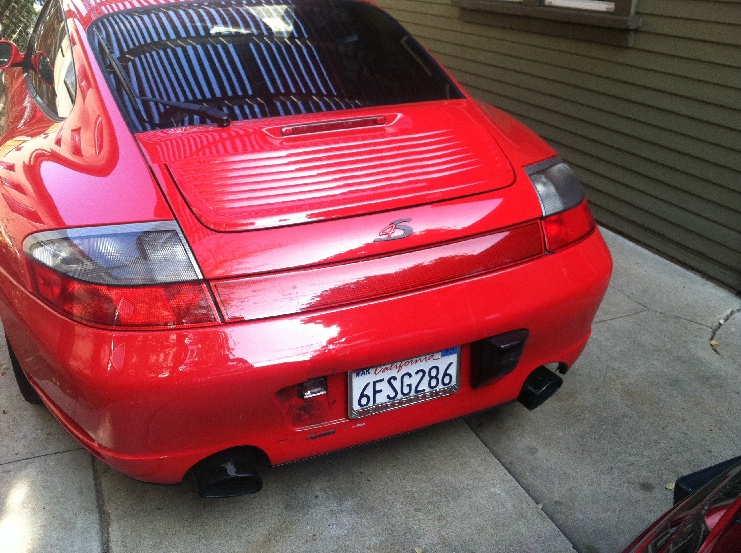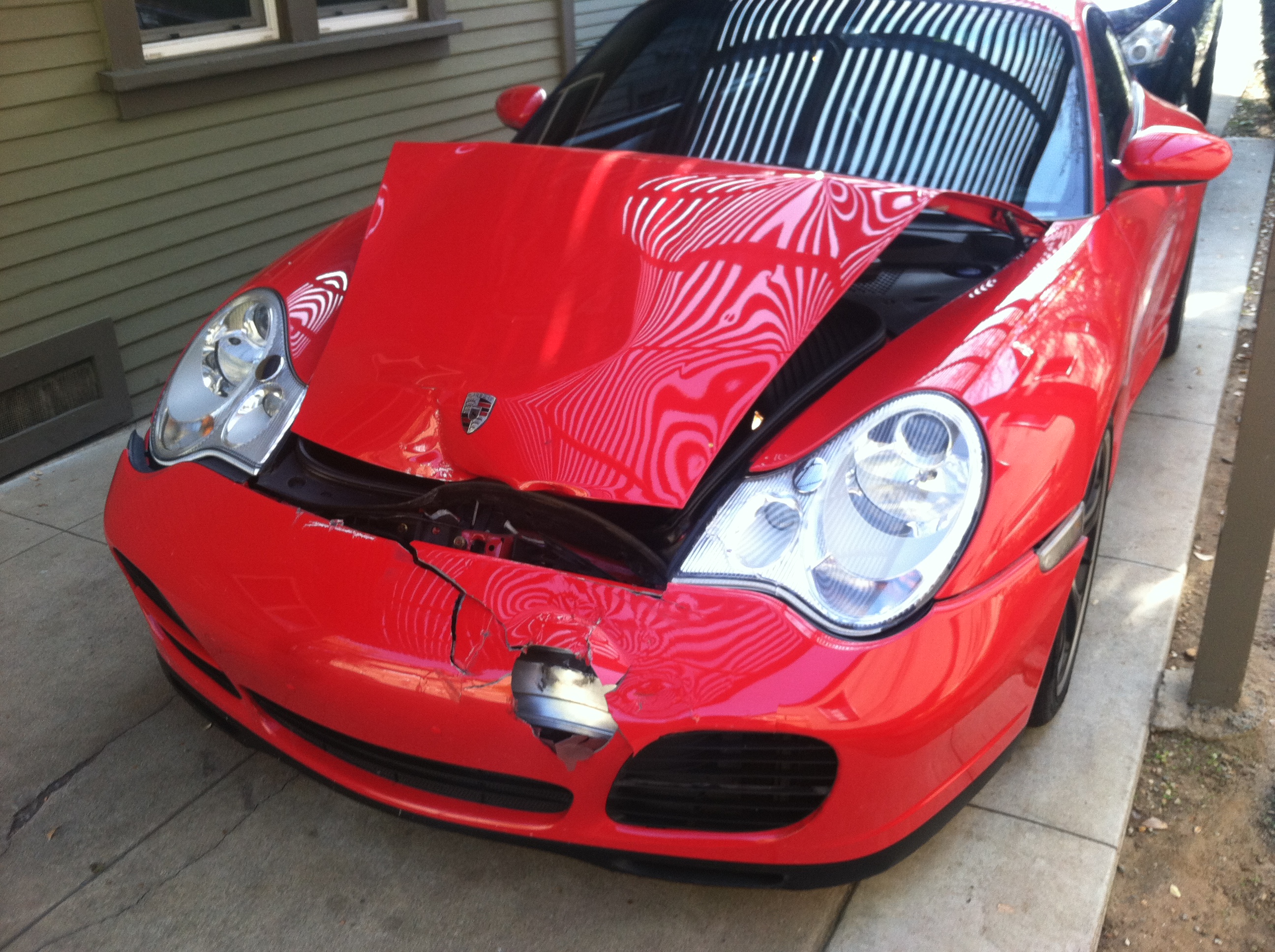 Hey guys I need some input on which way I should go on my car. I have a 02 C4S with 42000 miles. Long story short, on January 3rd 2014 I was on the 210 fwy in Pasadena Ca. when traffic suddenly came to a stop. Unfortunately the 20 yr. old driving his dads 83 Chevy pick-up didn’t and plowed into the back of me and pushed me into the Toyota Pre Runner that was ahead of me. I’m fine but the car is not. He’s my dilemma; the insurance company has decided the car is a total loss but it can be fixed for much less than the insurance company quoted. The frame is straight, motor and trans shift and run smoothly, the quarter panels and doors are in perfect shape. The parts that took the hit are the front bumper and hood, terminal piece, spare wheel well, Rt. Head light, rear bumper and taillights and other stuff under the bumpers. The car does not leak anything.