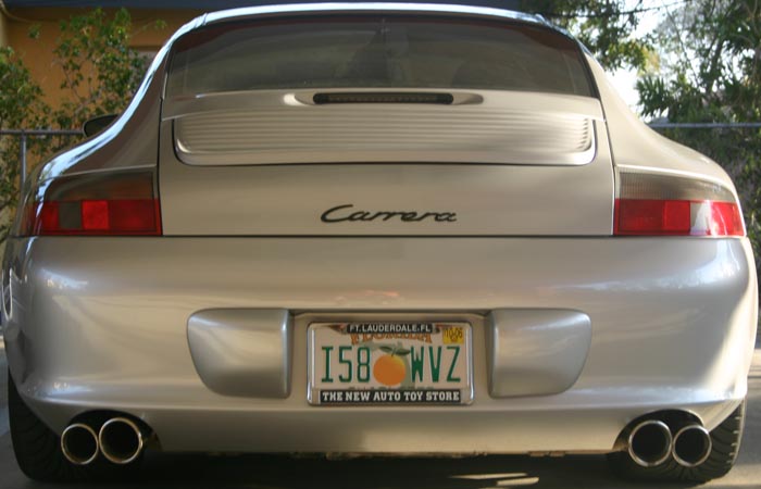 Type 911 in England. Pelican Parts also sells a similar set. I had some quality issues with Type 911. They ended up sending me two sets of tips. Between the two I got a good pair and they told me to keep the rest! I installed them on the stock exhaust and they looked perfect. Then I took it all apart and installed my headers and the sport cans. Now the right tip sticks out about 1/2 inch farther than the left. Since that pic was taken I've adjusted them a bunch of times and I'm finally happy even though they are not 100% even. Expensive though - you really have to want quad tips and there is a paucity of options for 02 + 911s.