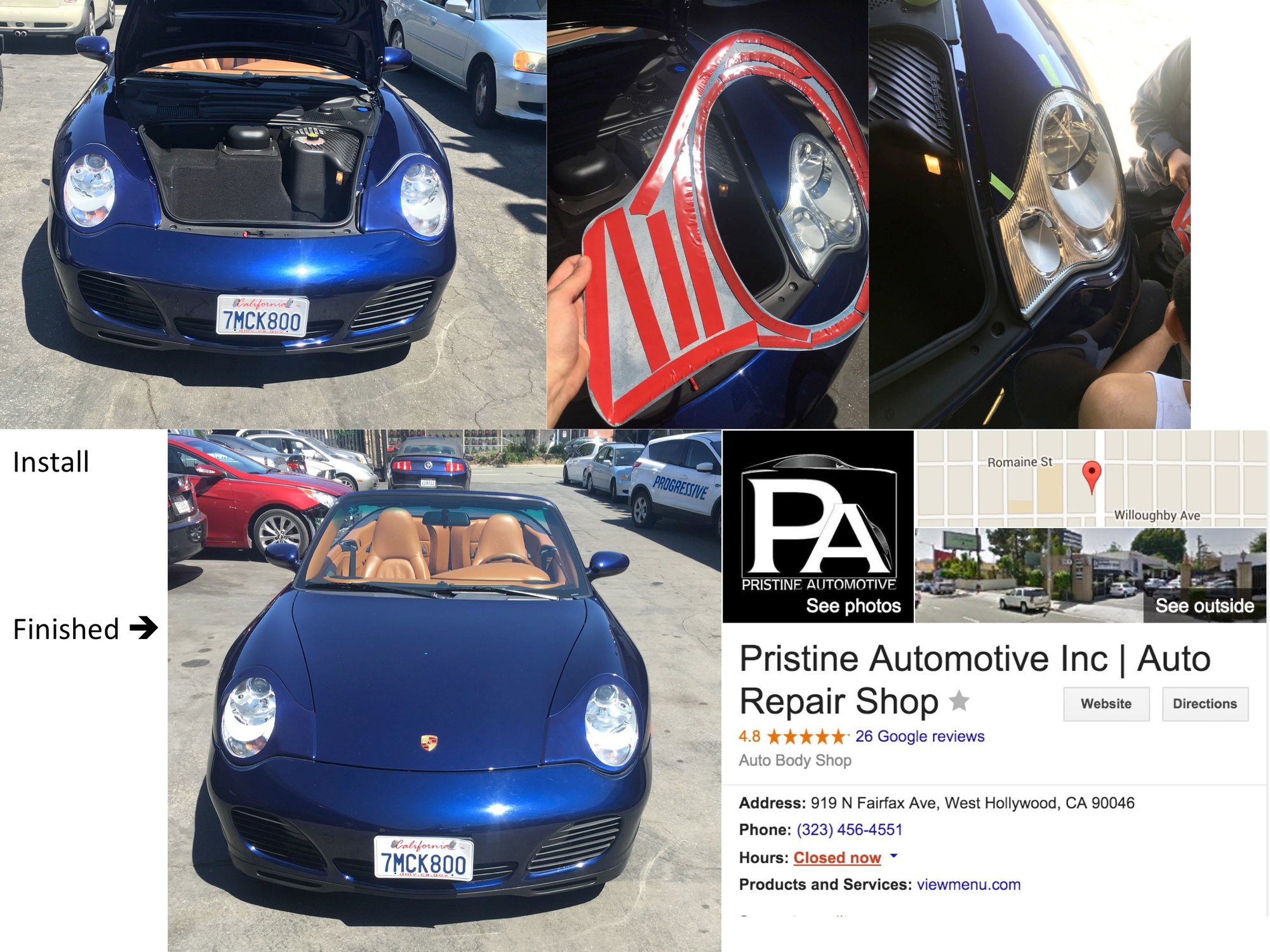 I am in the LA area so I am attaching the places where I have the work done. So far my experience with Pristine Auto on FairFax was phenomenal. The Owner is a Porsche lover and did my headlights for $100 even once I brought in the parts.