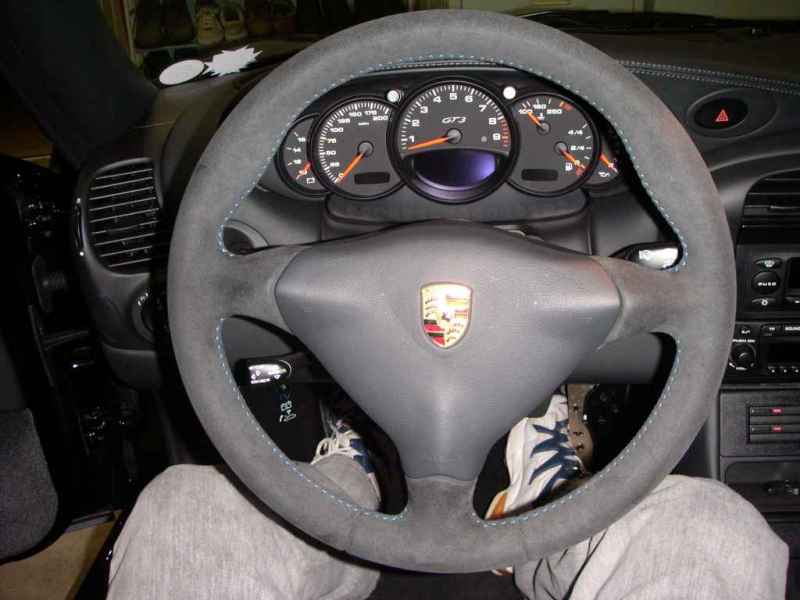 Thanks to Dave's excellent instructions, I was able to swap the steering wheel out in about 15 minutes working time. I took me a day to borrow the right socket and wrench form a friend though. The color the steering wheel matches the Natural Gary Leather interior perfectly also. As to the blue stitching, it blends in quite good also (they kind of stands out due to the flash in the picture, but blends in quite out under natural light).