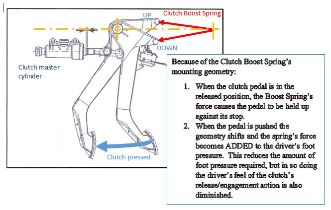 Attached helps illustrate how the Clutch Boost Spring effects the force required to actuate the clutch pedal. A broken spring would act like a very light or missing boost spring.