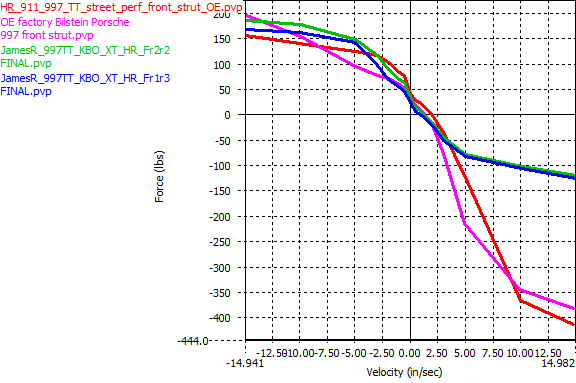 I decided to share a shock dyno for my fronts. The blue line is the final, the others are labeled for what they are. Factory NON- PASM, H&R off the shelf, and then the revisions to final for my fronts.