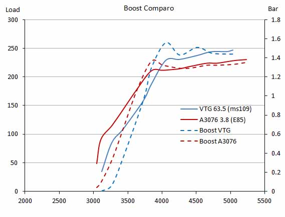 Looking at the chart, its pretty clear to me that the pulls were not started at the same RPM. We'd need a much more controlled test pulling same gear same RPM to be able to tell the difference in spool. Either way, the alphas appear to spool very similar to the vtgs, which is the experience of the big tuner shops as well. Clearly this thing is going to make some power. Now where are the 60-130 times ;-)