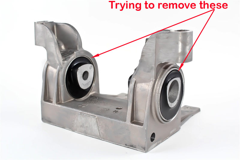 Now I am trying to get the factory/OEM inserts out, and cannot really think of any good way to achieve this? The rubber is super tough. I do not have a press, so am thinking of ways to cut it? hammer it? Heat it?