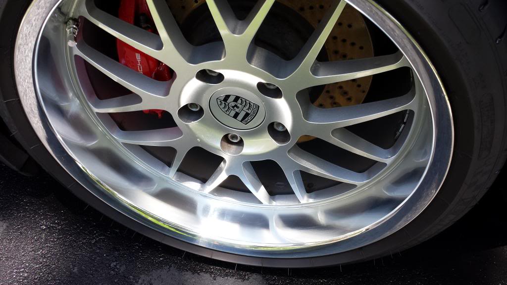 The finish is totally unique. It is a forged, one piece wheel, but the outer lip is polished, then clear coated and the centers are painted in a deep metallic silver. No matter how dirty they've been, they've come clean with soap and water and no harsh "wheel cleaners". If I don't own a Porsche wide body, I may be using them for coffee tables before I sell them!