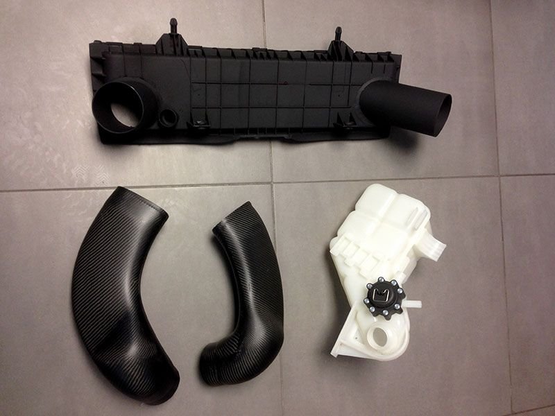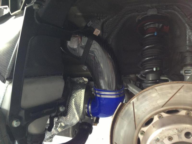Comes as a complete kit: stock airbox with bigger 4" holes in the back, a new coolant overflow tank, 4" ducts and the carbon piece. You will have to cut a hole just behind the intercooler shrouds to connect the carbon piece to the ducts.