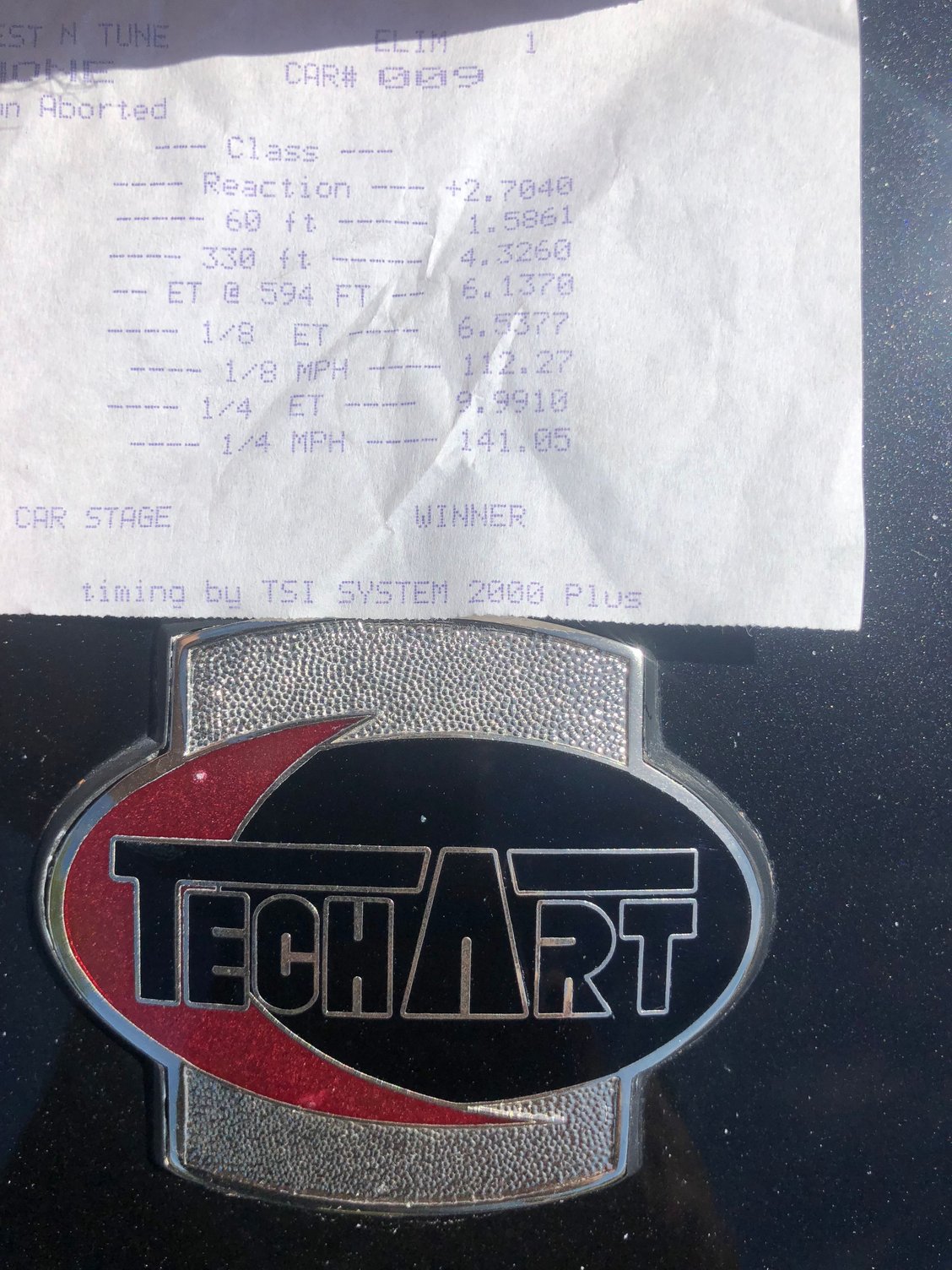Member Ringlord has sent his 1/4 mile time slip. His car is a daily driven 2003 996 turbo tiptronic, full weight, RWD, EFR7163 on pump/meth 10.04 @ 141.20