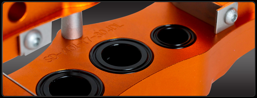 Our extreme lightweight caliper comes in differential bore configuration. It is machined from aircraft quality billet, weighs just over 5lbs. each, and has machined in protection grooves for the bridge tubes. Aluminum pistons, high temperature seals, and stainless steel brake pad wear plates are also standard on each caliper design. The opposed piston caliper design greatly improves pad wear and caliper rigidity over the OEM design. The stainless steel brake lines stop expansion under pressure.