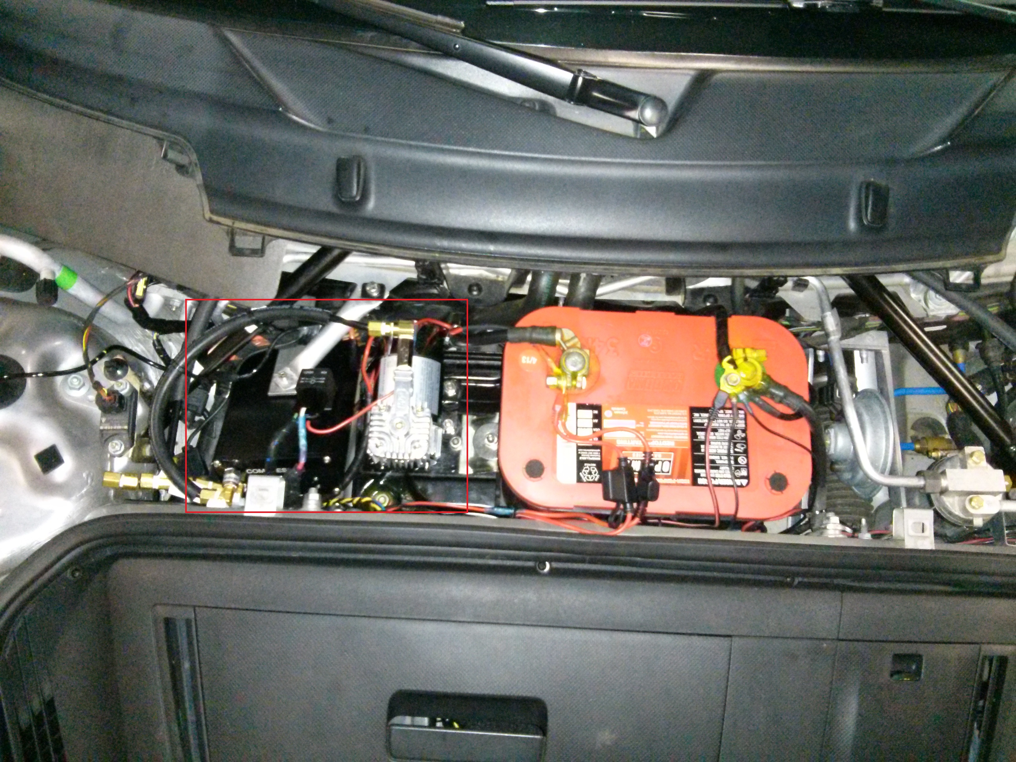 I looked at the K&W version and the TechArt version but both of those are hydraulic and I didn't want to run the risk of a leak or a burst and have hydraulic fluid leaking or spraying all over the place in the front section of the car. When I installed mine I used the optional auxiliary compressor they offer which is stronger and faster than using the compressor that's part of the OEM roadside assistance kit, but either will work. I installed an Optima 34R battery to make enough space in that area for the auxiliary compressor and then fabricated an angled mounting bracket and support for the AirLift control box so my installation is completely hidden once the front trunk trim panels are refitted. I inlcuded a shot of the battery, compressor & control box installation.