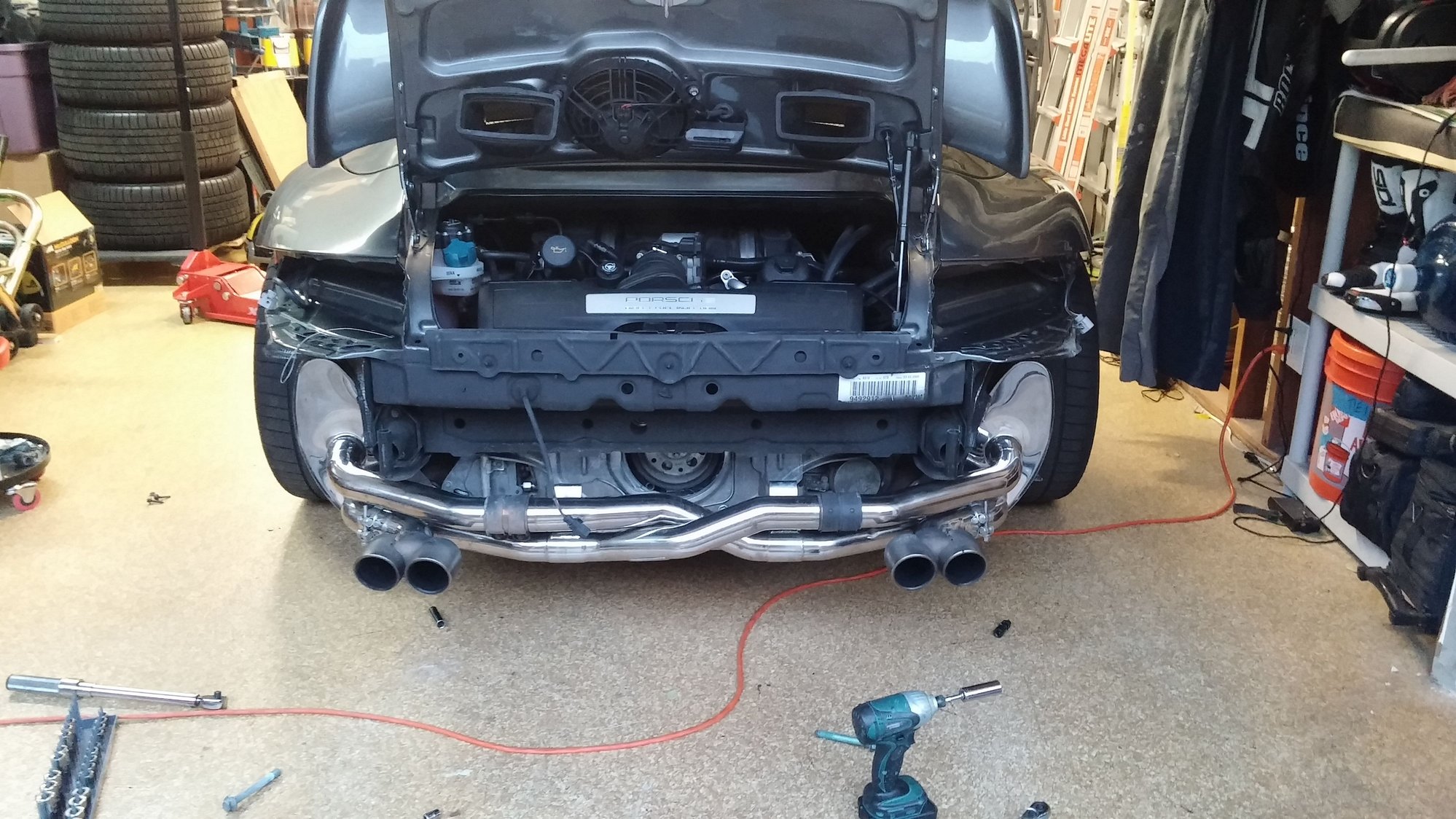 New photos today since my November project changing the fixed RUF Bi-plane rear spoiler to an active aero unit (like the TT). Upper wing now parks on-top of the fixed lower spoiler - goes up automatically at 77 mph and back down around 40 or via the console button. Installed Fabspeed's new Y-Pipe Intake this weekend too.