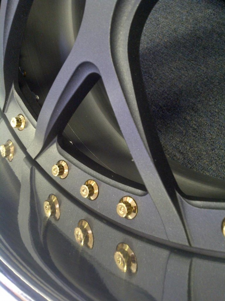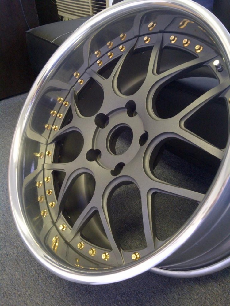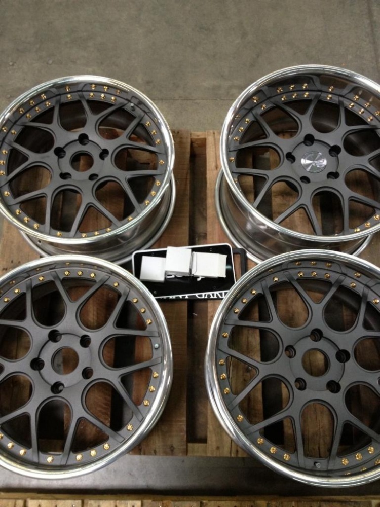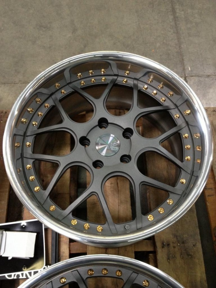 19x8.5 and 19x11 AG Forged F210 Titanium Center w/High Polish Lip and Gold Hardware.