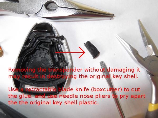 Removing the transponder is the hardest part, because (on the 997.1) it is glued in. Note that your new key will not work without the transponder, so you must remove it, and you must be careful not to damage it. This step will probably result in you destroying your original key.