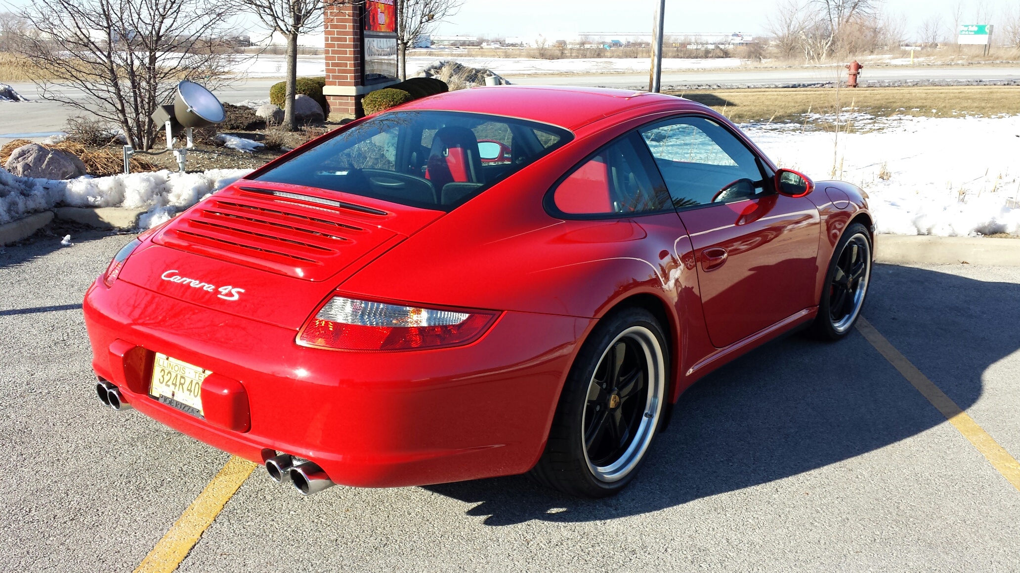 I picked up my 2006 CS4 today. Guards Red with red interior trim, seat backs, dials and belts. 23,330 miles and in fantastic condition. Porsche CPO with 2 year bumper to bumper warranty, excluding consumables. I was looking for other wheels. It came with the "lobster fork" style, which are nice (I am keeping them for the future) but wanted something, IMO, that was sportier.
