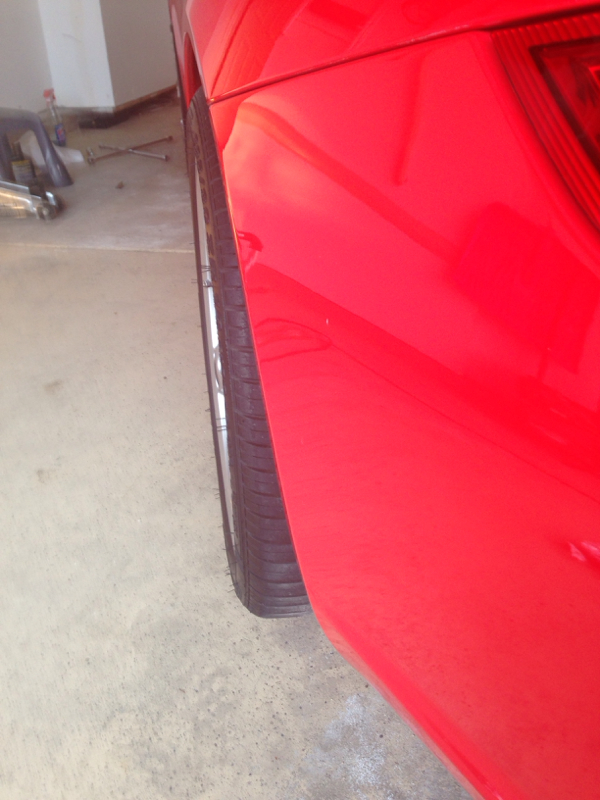 Here are the best shots I have that fairly show the difference when viewed from behind. You can see from the temp tags that it was one of the very first things I did (I had removed them from my trade-in and put them right back on the new car). To me, the inset on the first photo just appears wrong to me now that I've gotten so used to the more offset look. I don't think the offset looks radical at all, just better.