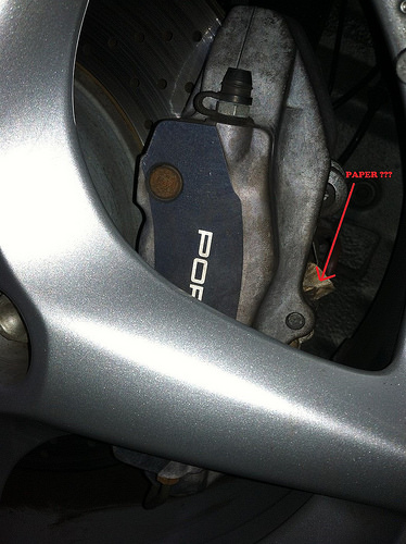 I noticed some heavy "paper" stuck in or behind the front caliper on my '06 997 C4. Any ideas? Maybe a gasket? Any ideas. THANKS!!