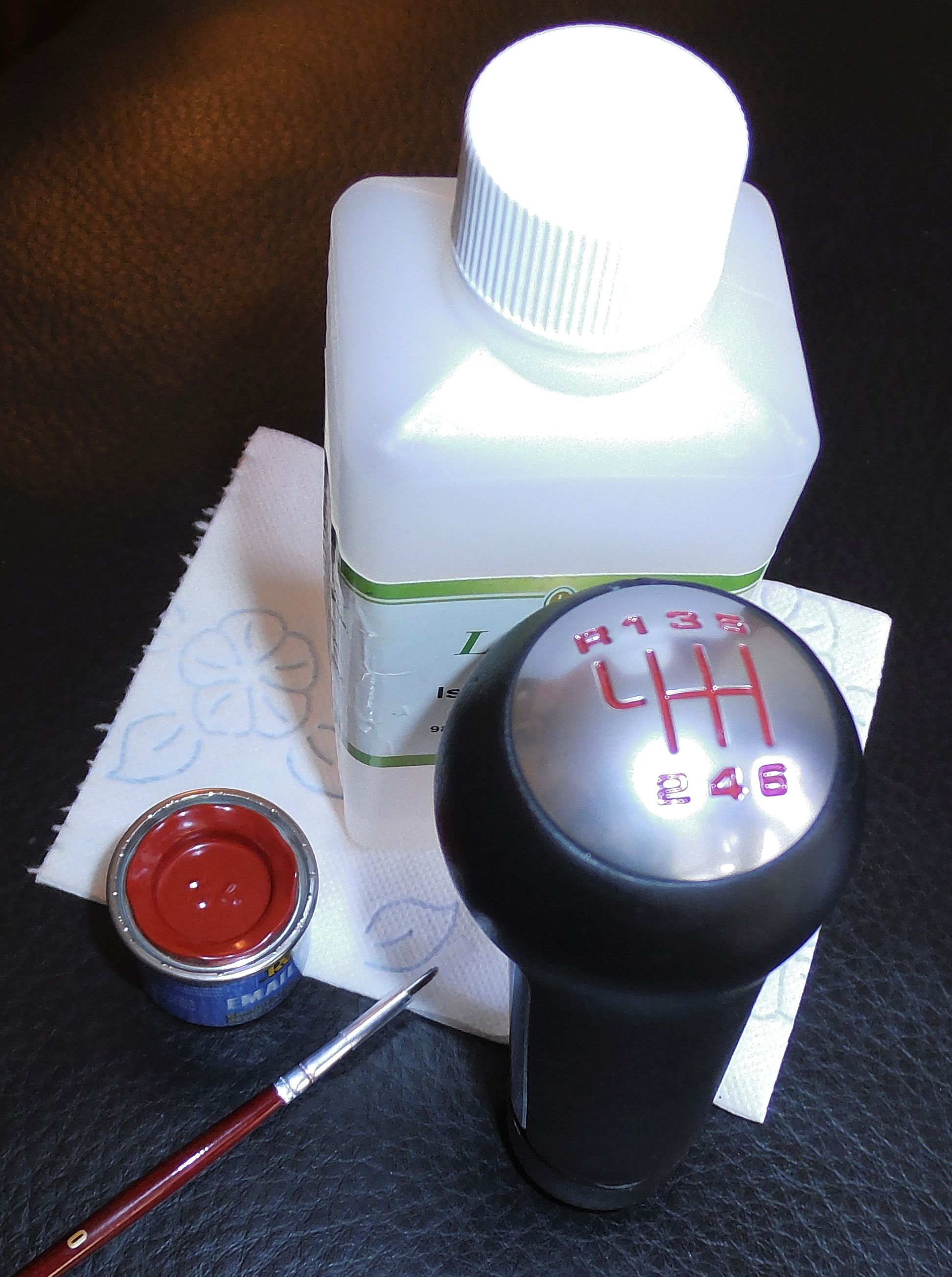 First dab some alcohol on the toilet paper and clean the shift **** plastic piece. Then fill in the numbers and lines of the shift pattern with paint and dont worry if you get any paint outside the lines. Wait for 5 minutes and then carefully wipe off the excess paint. You want to avoid getting any lint down inside the numbers. Wait 5 more minutes and you're done!