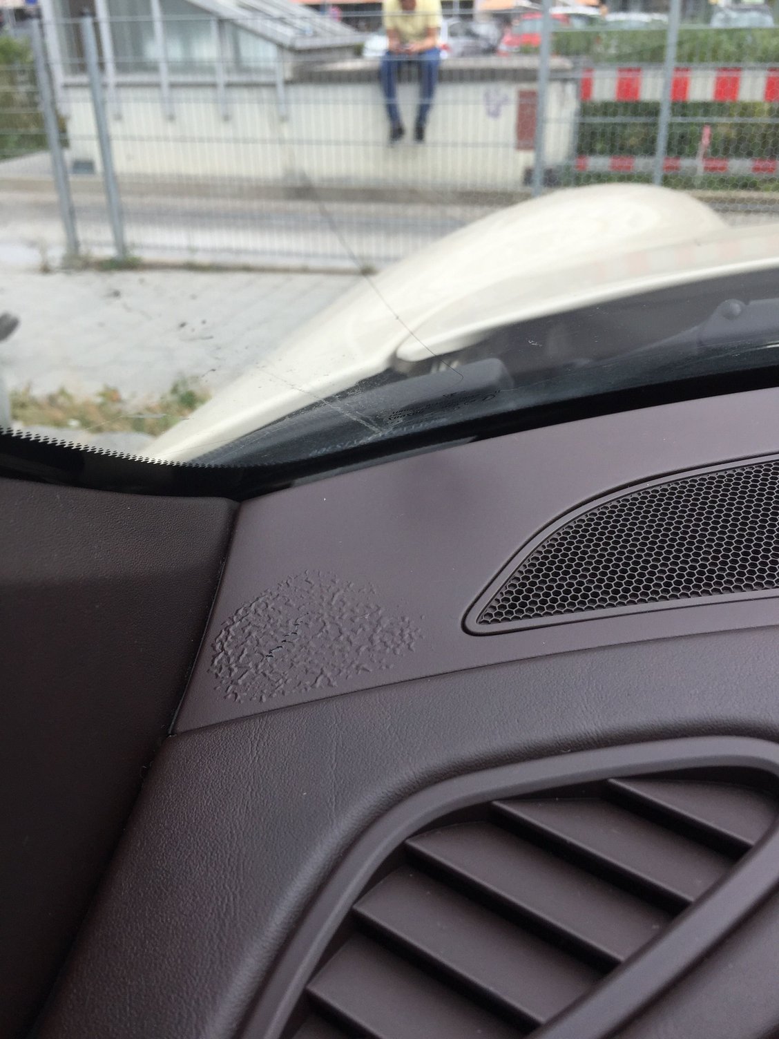 I just remembered that with a previous non-porsche I inflicted similar damage with an air freshener or similar, the freshener was placed on the surface on a hot day, the fumes were enough to crinkle the finish.