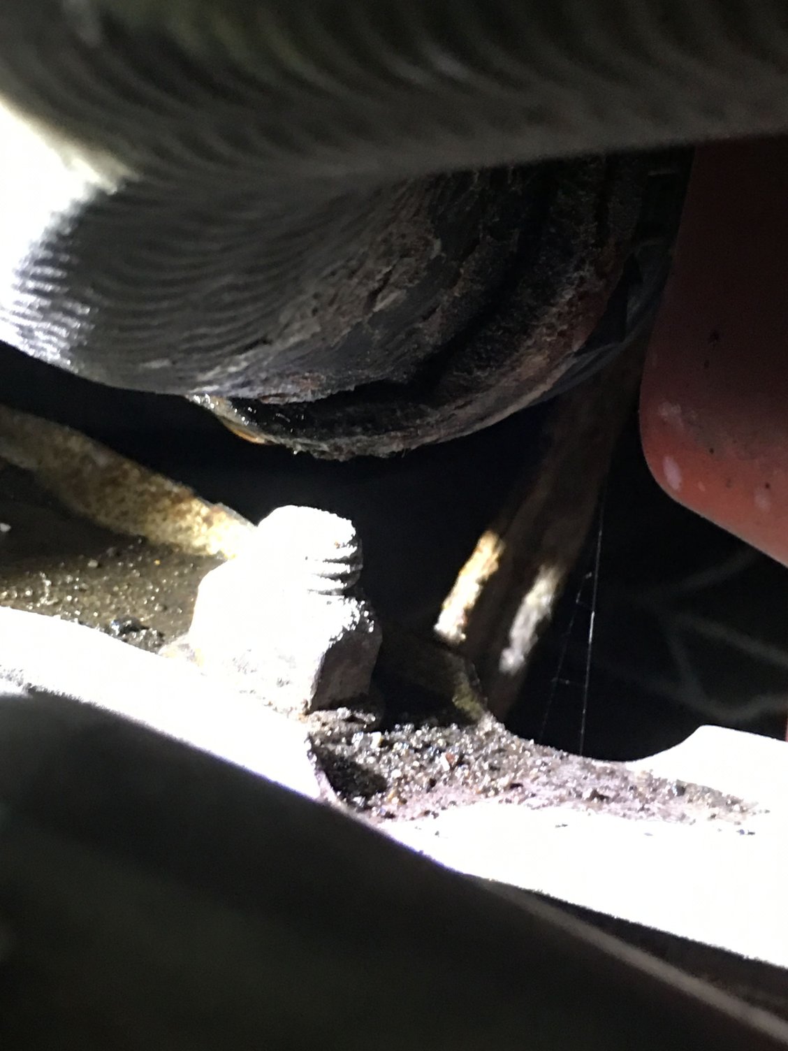 2. Even with could be a leaking shock or leaking lower control arm hydraulic bushing. It would be almost exactly even with the center of the wheel. For the LCA the underside will be wet/oily but the top would be dry. A leaking shock would be obvious, maybe visible with the wheel turned all the way in one direction so you could peek into the wheel well.