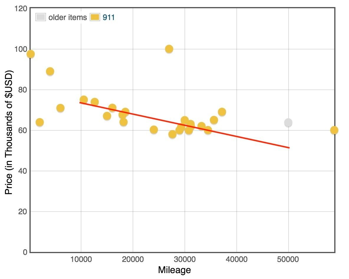 I understand your slope and your reasoning. What I don't understand is the one yellow dot at $100,000 for a car with what looks like about 27,000 miles when everything else with roughly the same mileage is clustered around $60,000.