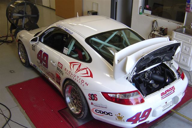 Phoenix, AZ (May 13, 2006) The Marcus MotorSports car #49, a Porsche 997, takes the checkered flag at the Grand American Cup GS race at Phoenix International Raceway. In preparation for Saturday’s race, the Marcus MotorSports team spent 2 days at Evolution MotorSports’ facility in Tempe. During that time, both cars underwent extensive diagnostic assessments resulting in computer calibrations by Garret Lim of GIAC to maximize the cars full potential. With GIAC’s reliable tuning and Evolution MotorSports’ V-Flow intake and tuning expertise, more measurable power was squeezed from the Marcus MotorSports #49 and #50 Porsche 997’s. This was accomplished by spending a day on each car, testing various setups to maximize power while maintaining reliability and fuel economy. Since the Grand American Cup is a very close series, every bit of HP counts.