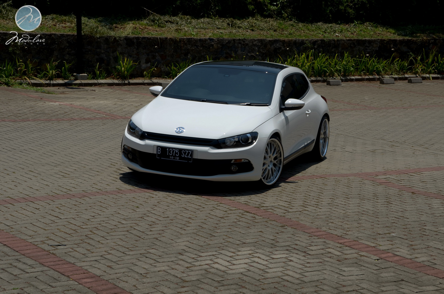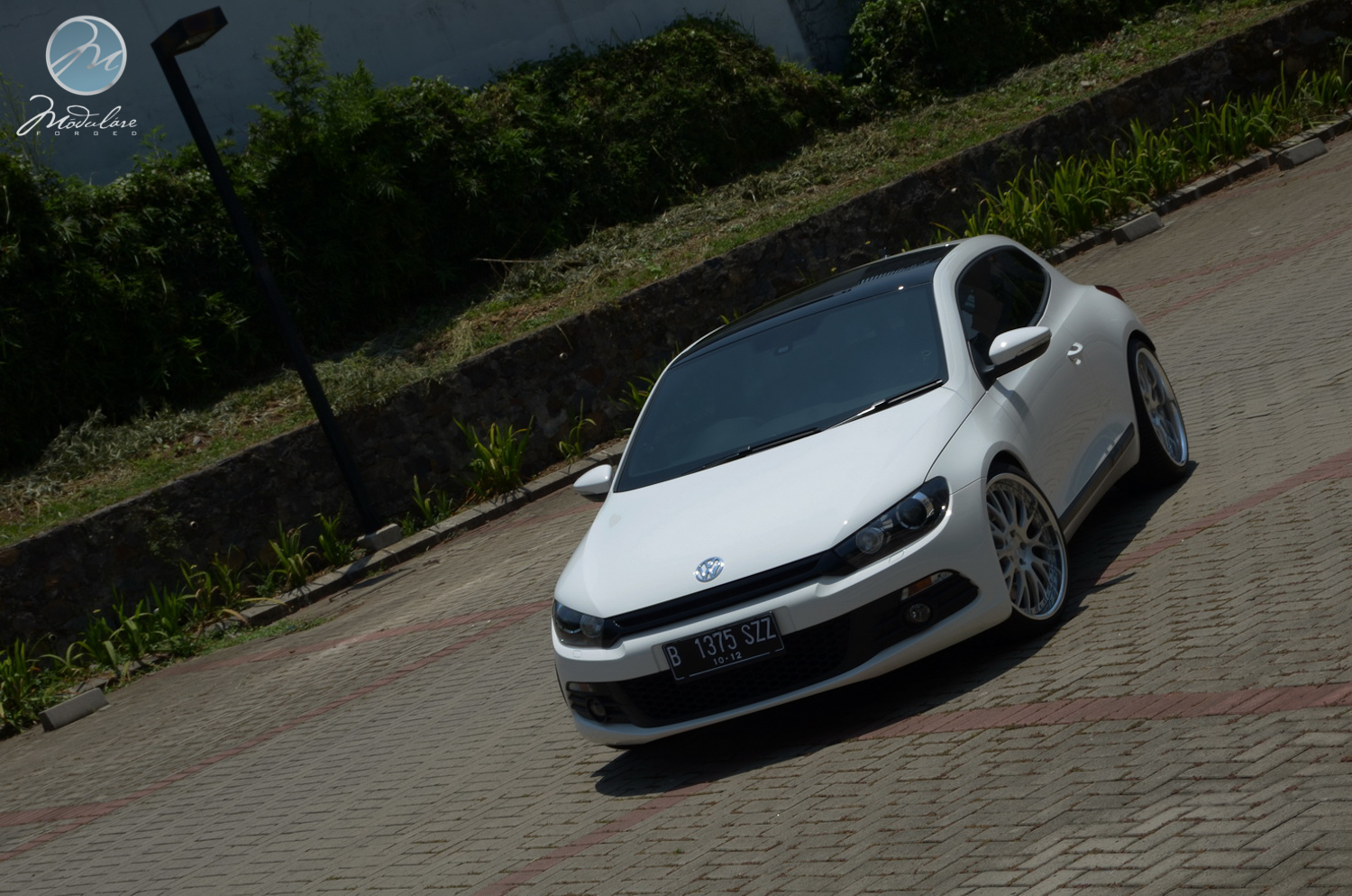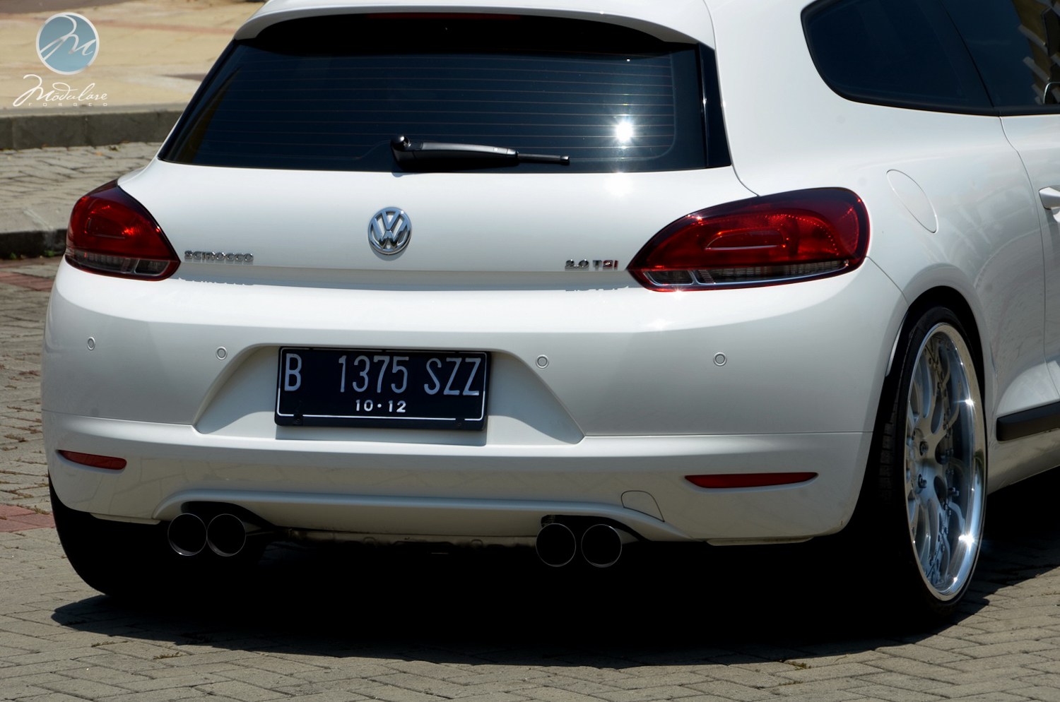 Thanks to our friends at Antelope Ban in Bogor, Indonesia, for setting us this 2012 VW Scirocco with a set of our 20” Modulare M24 3-piece wheels. The wheels measure 20x8.5 front and 20x10 rear, and are finished in the brushed aluminum finish with the optional etched aluminum centercaps. The car also features sport suspension from KW and a sport exhaust from Eisenmann.