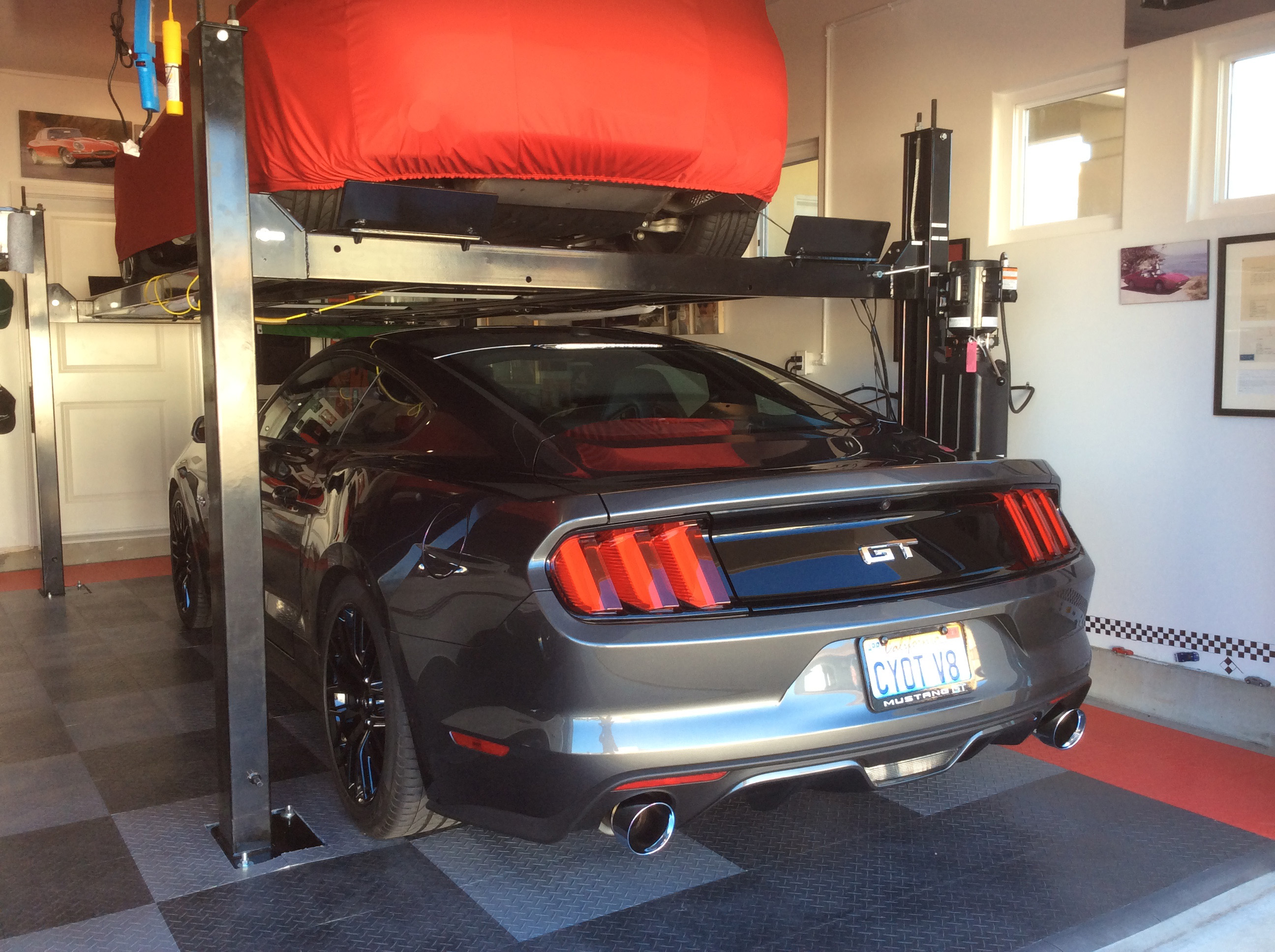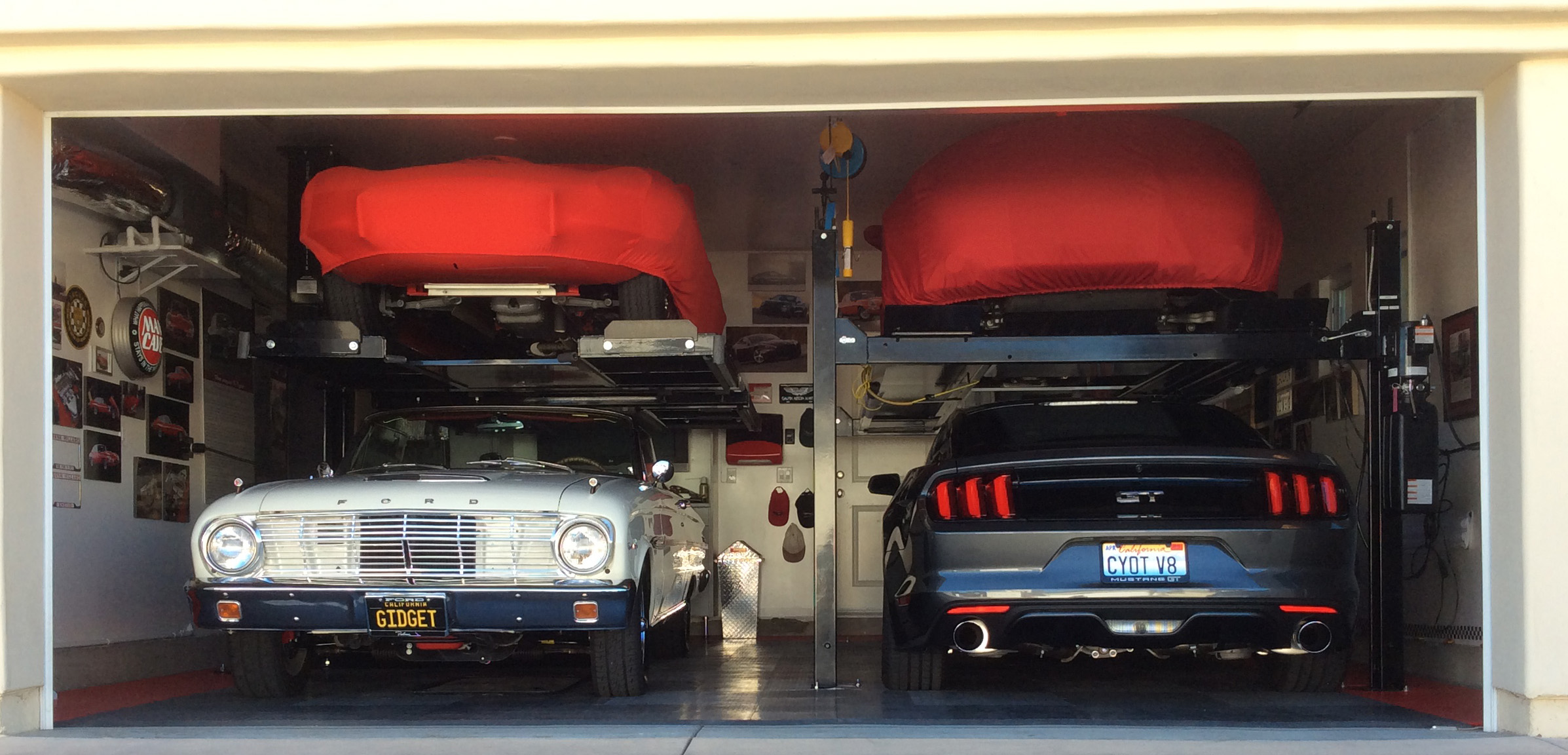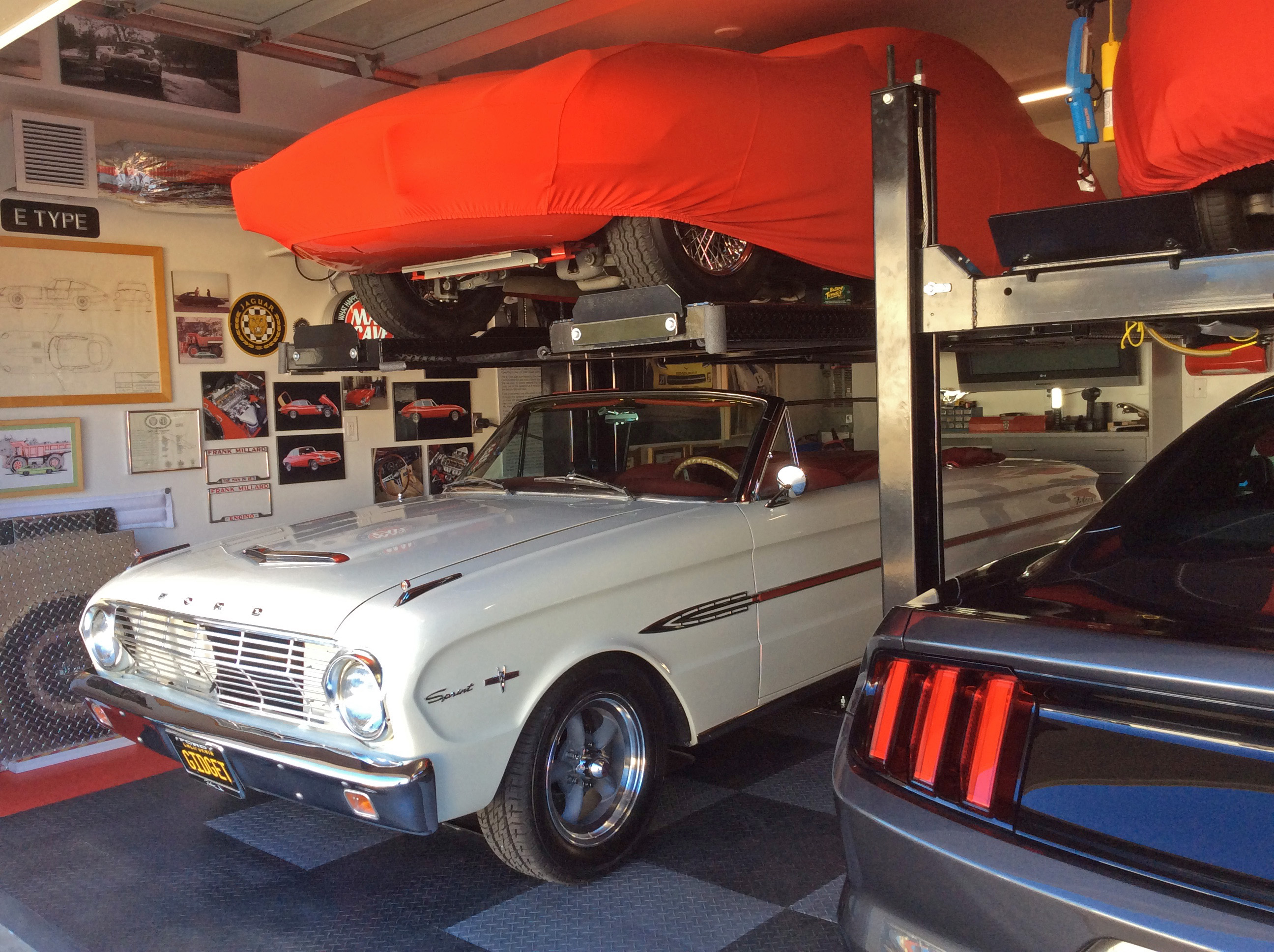 I love your car selection, and your garage storage solution. I wish I could have extended my garage back. I could only go up, with Racks. The cars that are on top covered, are my 1965 Jaguar E-Type coupe on the left, and my 2007 Aston Martin Vantage on the right. The cars on ground floor are my wife's 1963 Falcon sprint covetable, and my DD 2015 Mustang GT stick. We also have a 2012 Mini Countryman that sits in the driveway. The racks are from American Custom Lifts. The rack on the left is a one post, and the rack on the right is a 4 post. Both racks are rated for a max of 4500 lbs each. The heaviest is the Mustang at 3700 lbs.