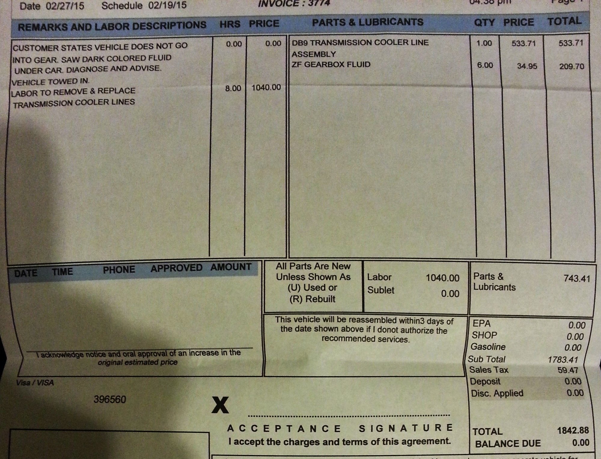 Below is a copy of the invoice. Although the timing of the hose failure made it seem that it could be connected to the recent oil service, it appears that's not the case, and my Indy Shop did what they do best...undercut the dealership. I wonder what the "kit" would have cost there?