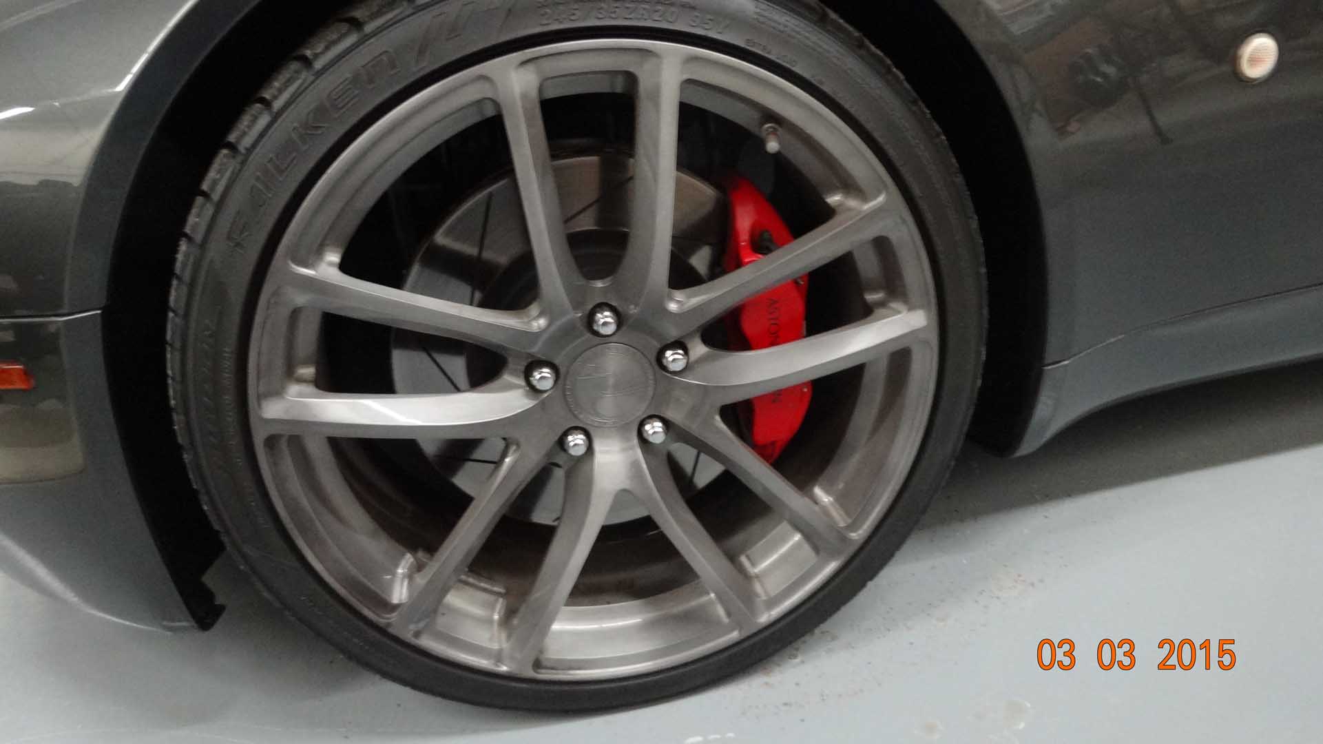 I bought mine used from the same Vantage as in the photo, so Modulare would have the specs. The tire size is 245/35zr20 front and 295/30zr20 rear