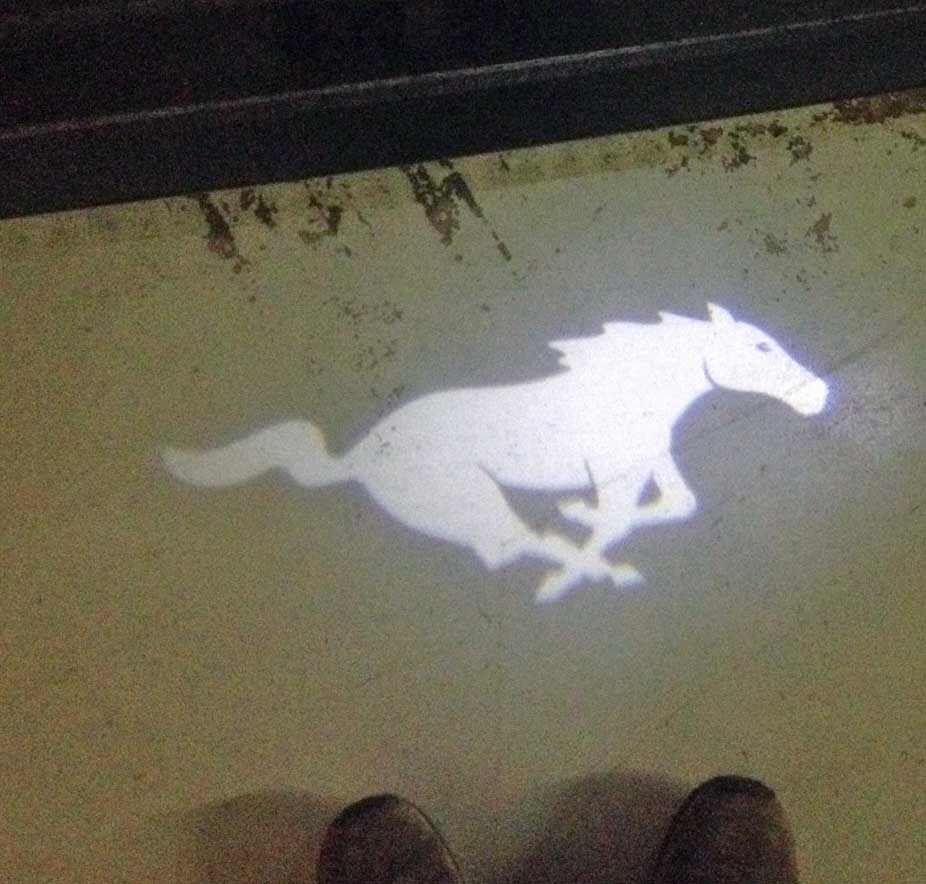 One of the very cool features of my new 15 Mustang undocumented is the image projected under each mirror (see shoes in pict for scale) when you touch the door handle on the ground at night. probably does not weigh hardly anything for an LED projection, could even do a GIF motion video or color!